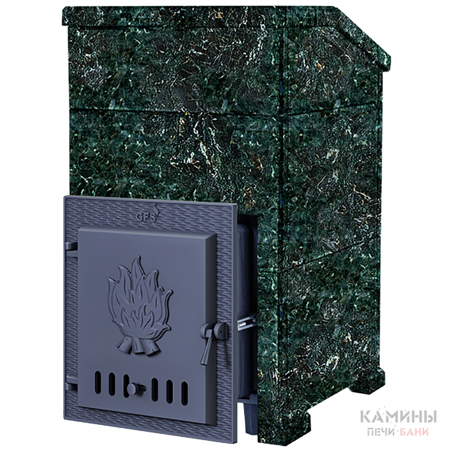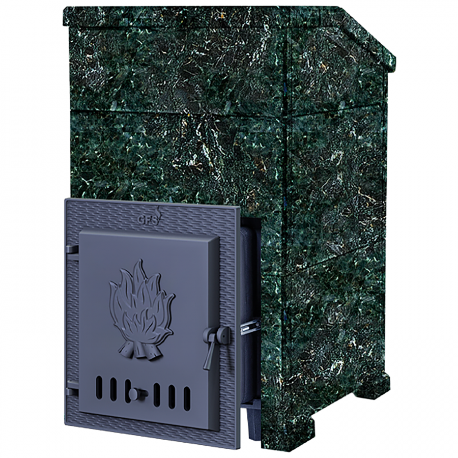 GFS Гефест ЗК 40 Президент 1130/40 Пироксенит - печь с усиленной каменкой большей массы, с единымуглублением внутрь топки для дополнительной укладки чугунного заряда.Теплосъемные шипы со стороны горения пламени в разы увеличиваютплощадь соприкосновения огня с каменкой и ускоряют передачу тепла, атакже способствуют лучшему дожигу, смешивая потоки пламени и воздуха, поступаемого из воздушника. Эти усовершенствования значительно повышаютмощность парообразования печи и выдают большее количество пара принепрерывной подаче воды. Каменка печей GFS Гефест-ЗК является незаливаемой.