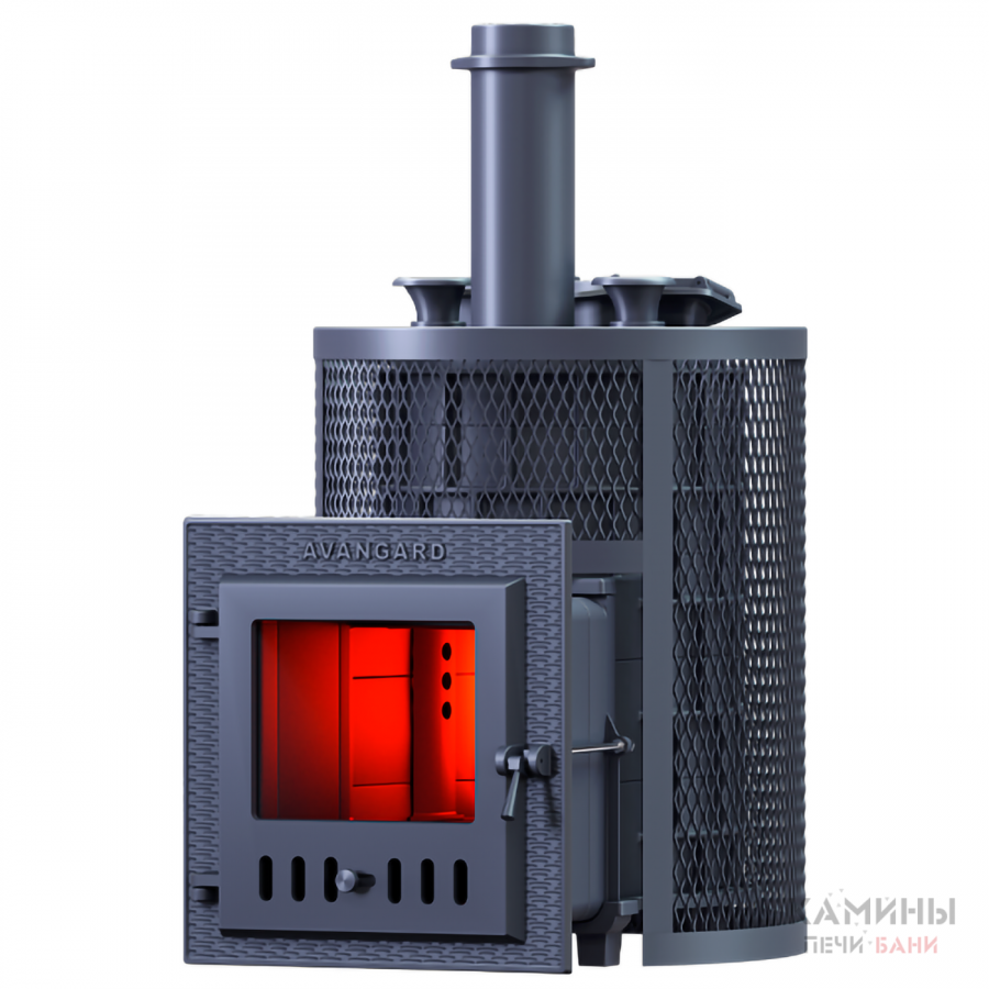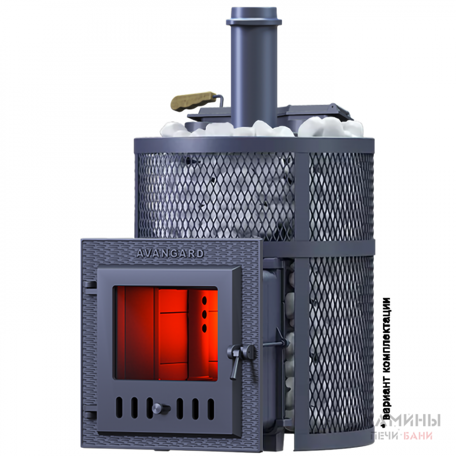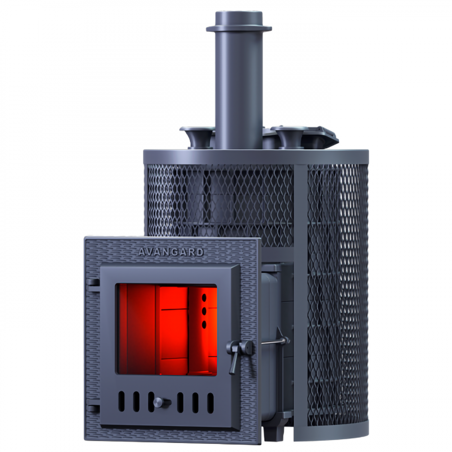Масса пароиспарителя в печи AVANGARD 51 кг, и он нагревается прямым контактом с пламенем. У пароиспарителя 2 поверхности с увеличенной рабочей площадью – снизу идёт нагрев огнём, а сверху поддаётся вода для пара. У печи уникальная, массивная каменка с теплонакопительными воронками, для получения легкого пара.