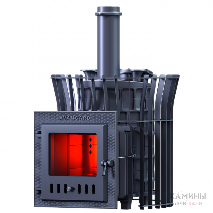 Масса пароиспарителя в печи AVANGARD 51 кг, и он нагревается прямым контактом с пламенем. У пароиспарителя 2 поверхности с увеличенной рабочей площадью – снизу идёт нагрев огнём, а сверху поддаётся вода для пара. У печи уникальная, массивная каменка с теплонакопительными воронками, для получения легкого пара.
