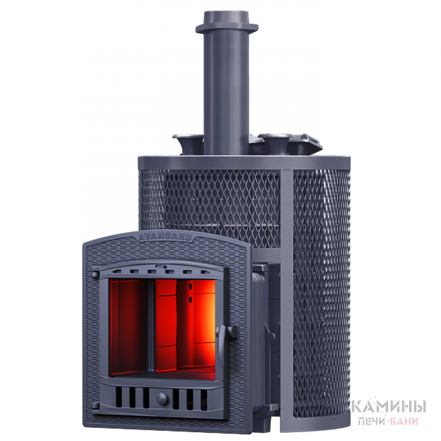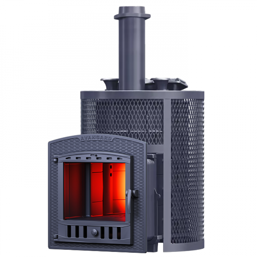 Масса пароиспарителя в печи AVANGARD 51 кг, и он нагревается прямым контактом с пламенем. У пароиспарителя 2 поверхности с увеличенной рабочей площадью – снизу идёт нагрев огнём, а сверху поддаётся вода для пара. У печи уникальная, массивная каменка с теплонакопительными воронками, для получения легкого пара.