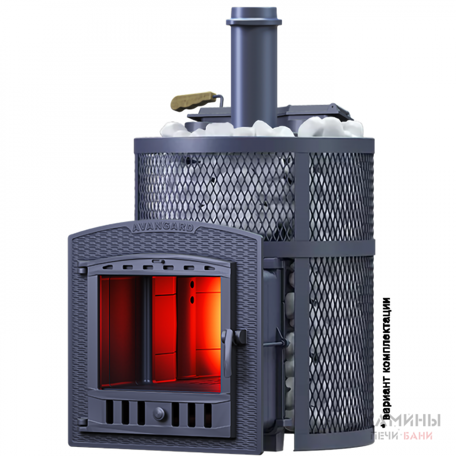 Масса пароиспарителя в печи AVANGARD 51 кг, и он нагревается прямым контактом с пламенем. У пароиспарителя 2 поверхности с увеличенной рабочей площадью – снизу идёт нагрев огнём, а сверху поддаётся вода для пара. У печи уникальная, массивная каменка с теплонакопительными воронками, для получения легкого пара.