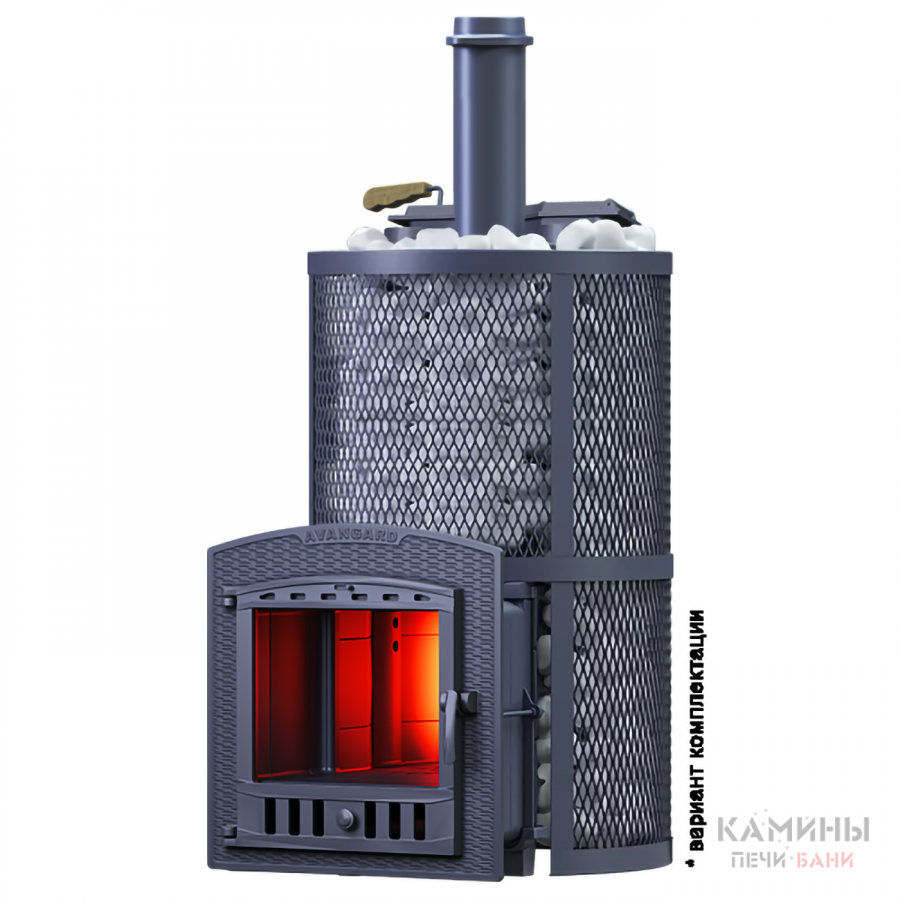 Масса пароиспарителя в печи AVANGARD 51 кг, и он нагревается прямым контактом с пламенем. У пароиспарителя 2 поверхности с увеличенной рабочей площадью – снизу идёт нагрев огнём, а сверху поддаётся вода для пара. У печи уникальная, массивная каменка с теплонакопительными воронками, для получения легкого пара.