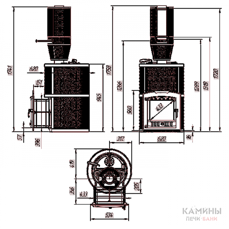 Под каменкой на 4-х упорах установлен рассекатель пламени, он разделяет пламя на 3 потока и направляет сначала на боковые части корпуса для интенсивного нагрева стенок и конвекционного нагрева воздуха в парной. Для этого на наружных поверхностях расположены конвекционные рёбра. Дальше пламя проходит через выступы к выходу в дымоход, нагревая каменку.