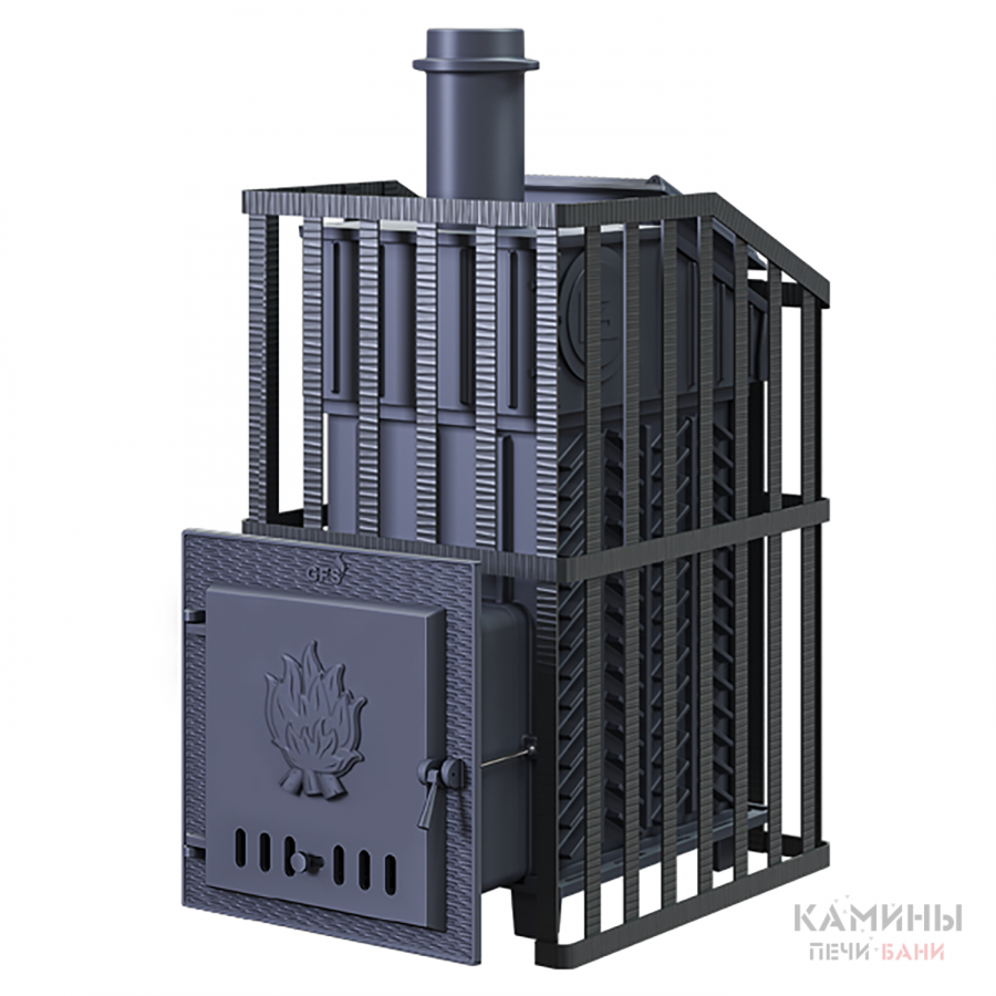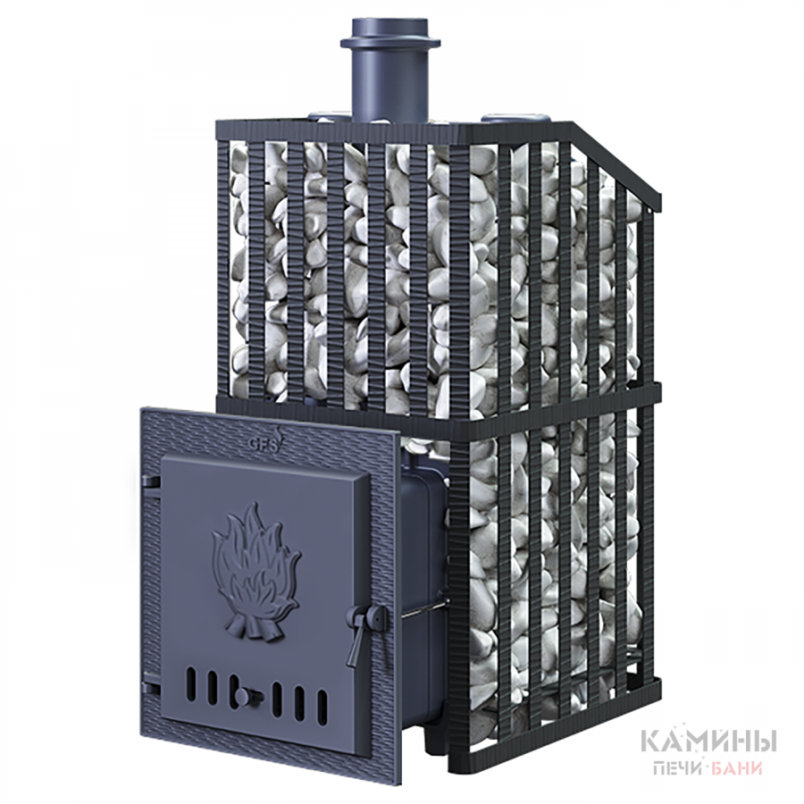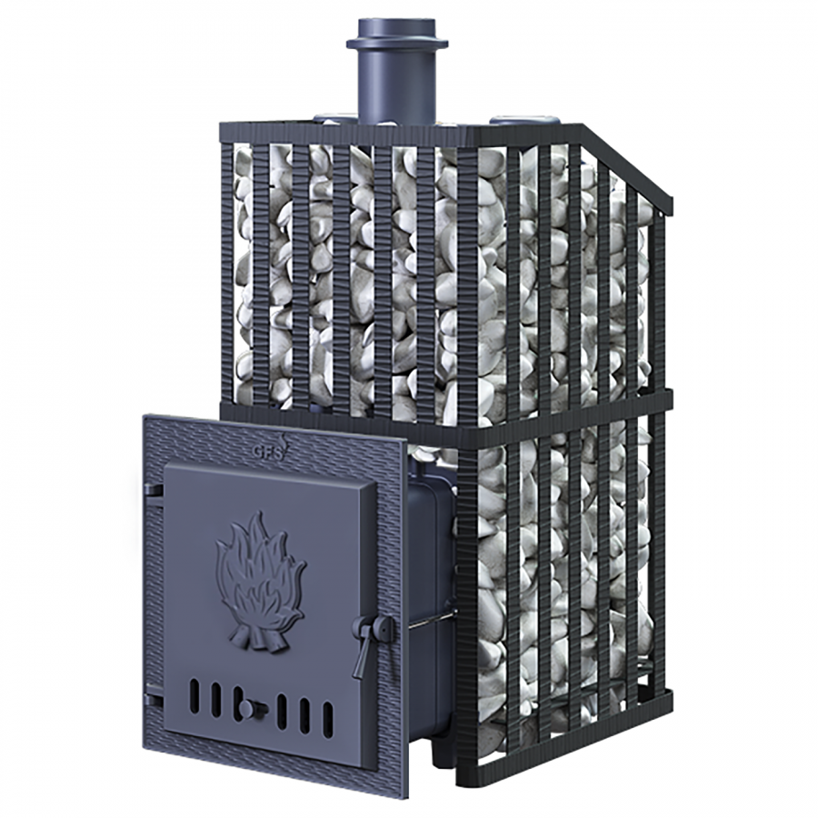 GFS Гефест ЗК Ураган 25 - расширенный комплект печи GFS Гефест ЗК в сетке. Максимально приближенный вариант печи для режимов русской парной, имеющий непосредственно закрытую чугунным коробом каменку, дверцу для пара с ручкой из бука, увеличенную до 50 см чугунную стартовую трубу. Печь легко модернизируется до полноценной печи предназначенной для Русской бани путем замены стальной сетки на каменную облицовку без демонтажа дымохода.