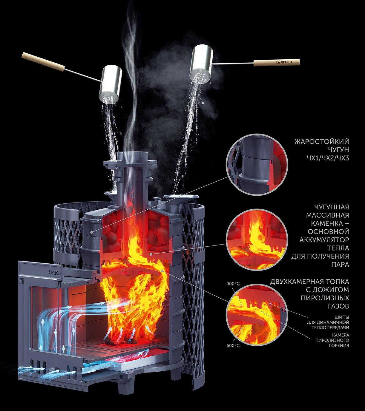 Печь эконом-класса со стенками толщиной 14 мм. Быстро нагревает воздух в парной и производит качественный мелкодисперсный пар за счёт теплоёмкой каменки, оснащённой теплосъёмными шипами на нижней поверхности.