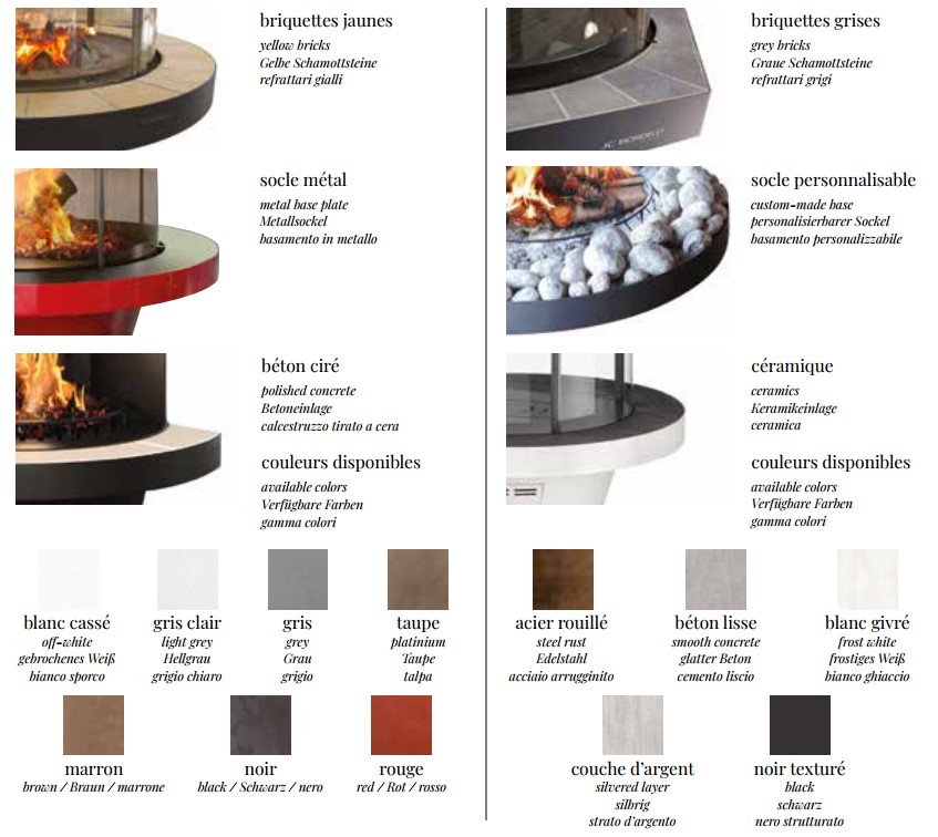Цветовая гамма для стандартного исполнения камина и для камина с шелкографией: серый антрацит, насыщенный черный, металлический черный, платиновый, шоколадный и металлический шоколадный. Краска обладает высокой температурной устойчивостью и имеет матовый