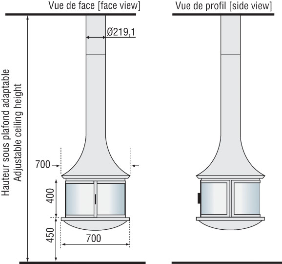Чертеж центрального подвесного камина Lea 998 JC Bordelet: