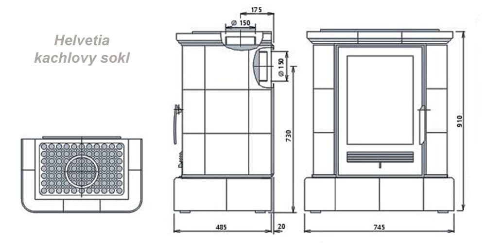 Печь камин керамическая Helvetia KP, с кафельным цоколем изготовлена из качественной стали. Большое остекление улучшает вид на пылающий огонь.