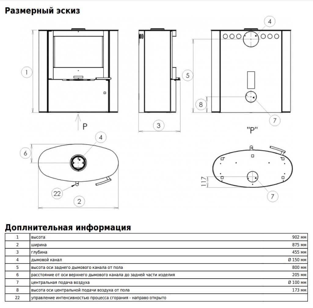 Корпус печи сделан из котловой стали. Самые нагружаемые места надёжно защищены вермикулитом. Дверь оборудована двух-точечным механизмом запирания. По всему периметру проложены уплотнительные шнуры, обеспечивая высокую герметичность камеры, а значит безопасность в эксплуатации. Сзади камин оборудован конвекционным экраном. С одной стороны это позволяет значительно сократить расстояние от печи до горючих стен (у омаха это 20 см), с другой значительно увеличивает конвекционный обогрев помещения. Выхлопной патрубок располагается либо вверху, либо сзади. К печи можно подключить внешний приток воздуха для горения. Его диаметр равен 100 мм, располагается сзади, на высоте 173 мм по центру оси.
