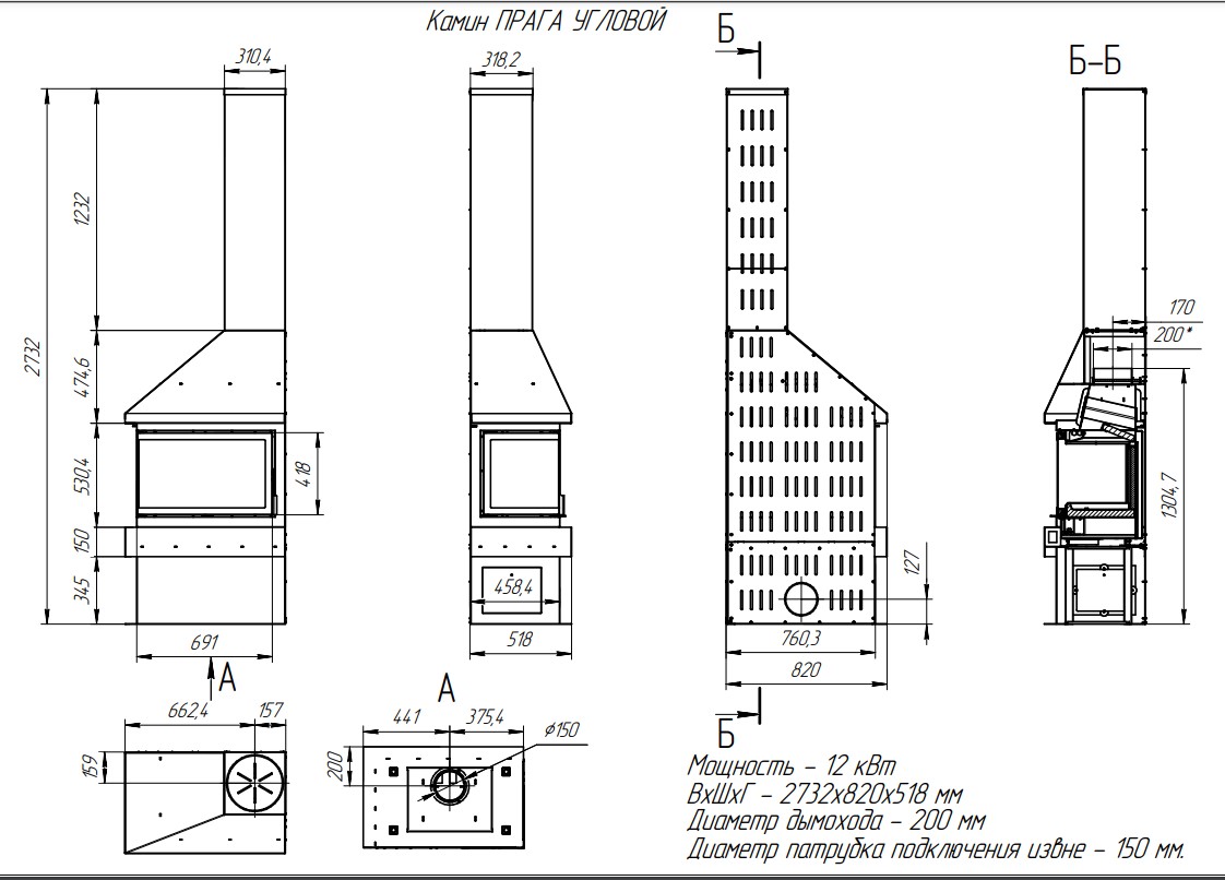 Широкое фронтальное стекло, а также дополнительное боковое, дают широкий обзор пламени и придают камину Прага современный дизайн.
