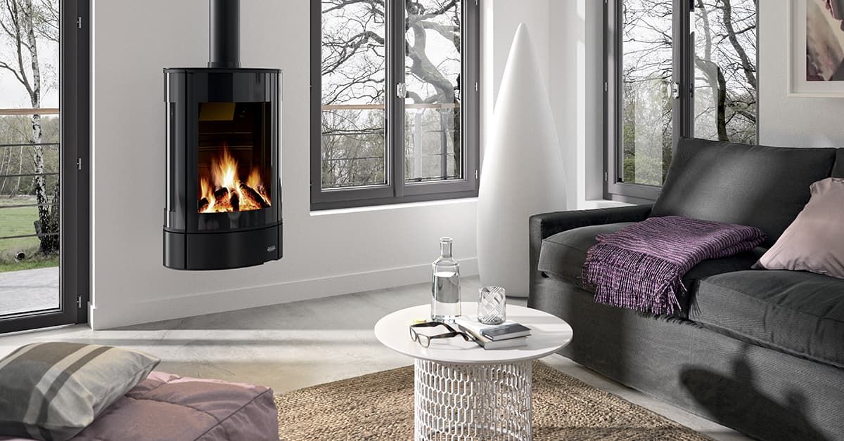Каминная печь Cheminees Philippe Corrano - подвесная застекленная с трех сторон овальная дровяная печь.