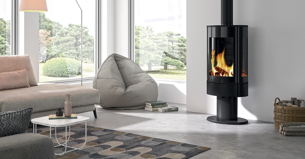 Каминная печь Cheminees Philippe Lozari - современная цилиндрическая дровяная печь с панорамным видом на огонь.