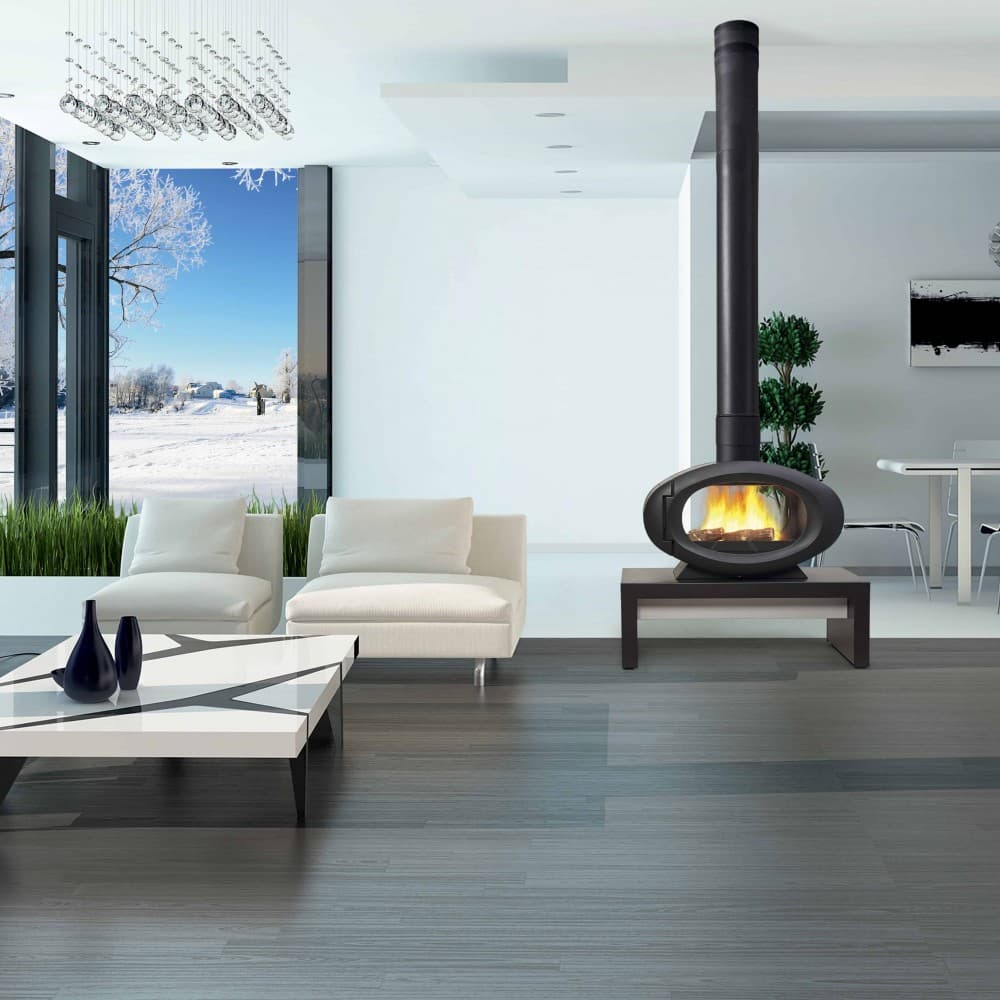 Каминная печь Cheminees Philippe Saudoy двусторонняя - овальная дизайнерская дровяная печь на стальной основе с двусторонним обзором пламени.