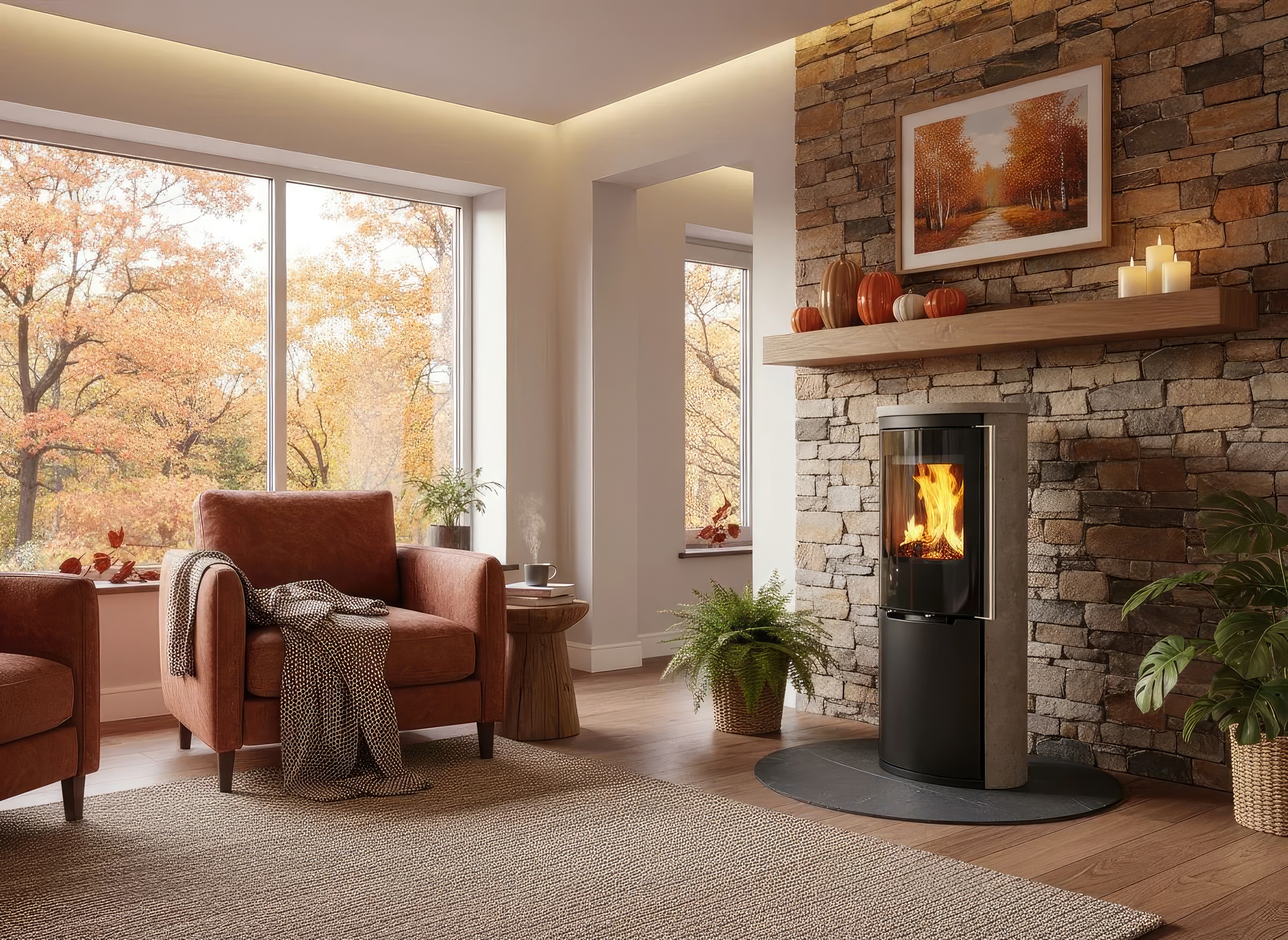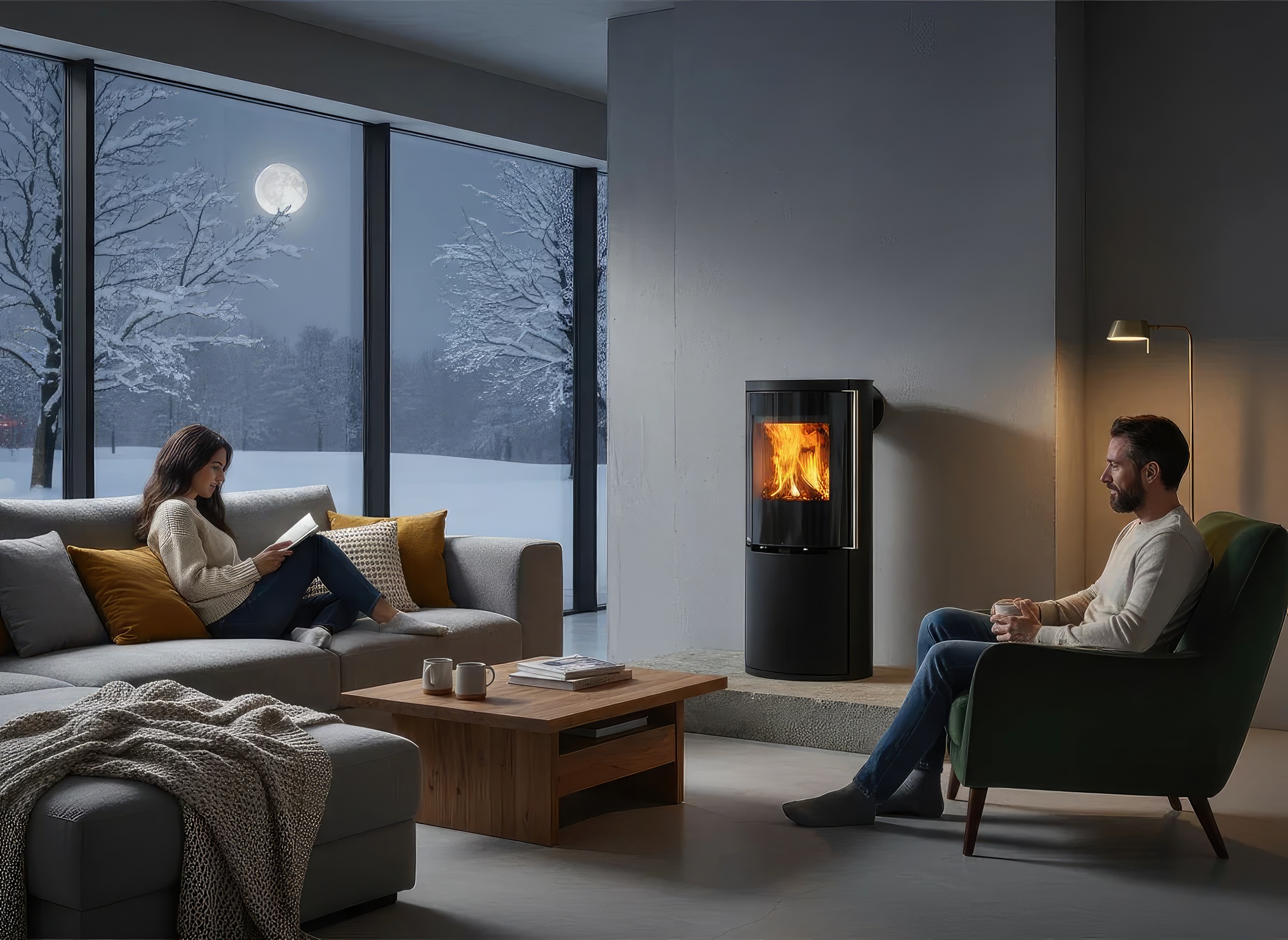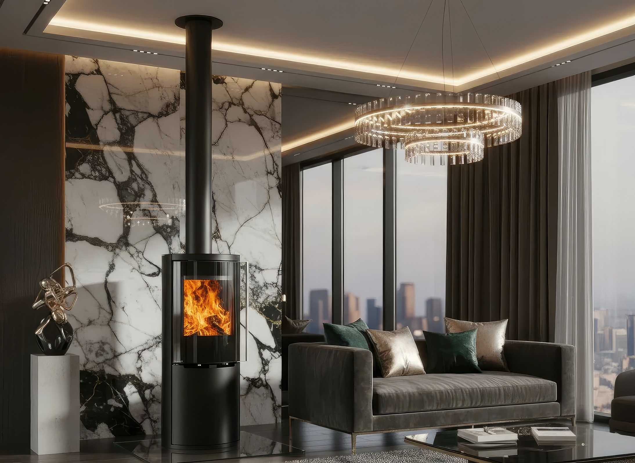 - Широкоформатный обзор: Остекление Full Glass с черной шелкографией обрамляет топочную камеру, визуально расширяя границы огня.