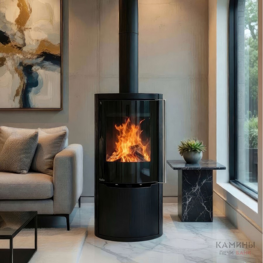 - Современный дизайн и качественные материалы — сталь и термобетон в топке.