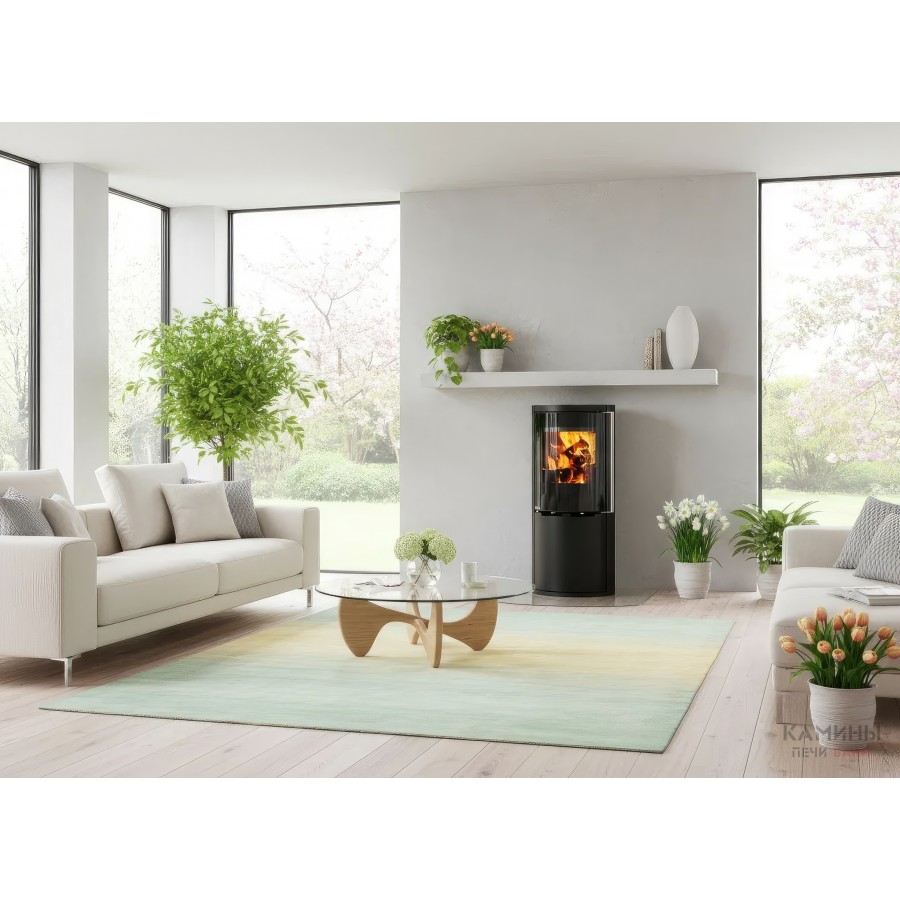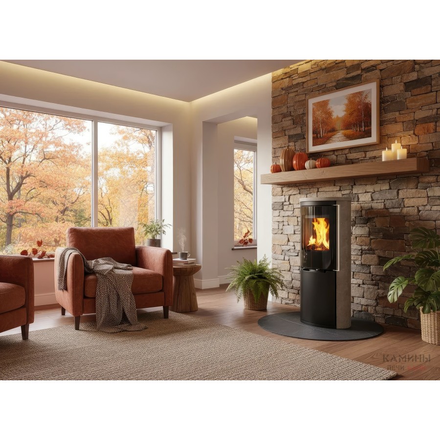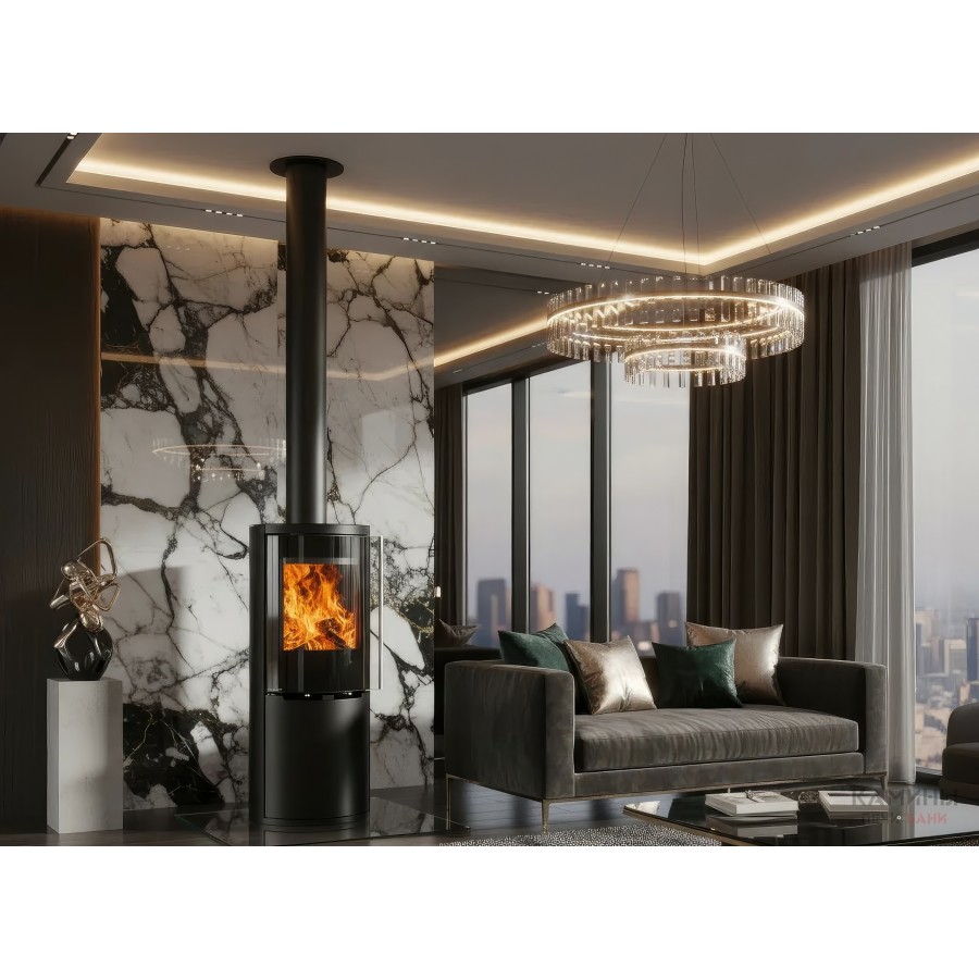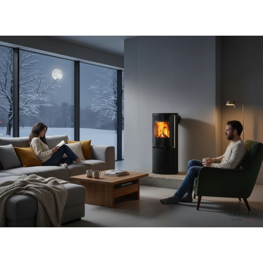 - Широкоформатный обзор: Остекление Full Glass с черной шелкографией обрамляет топочную камеру, визуально расширяя границы огня.