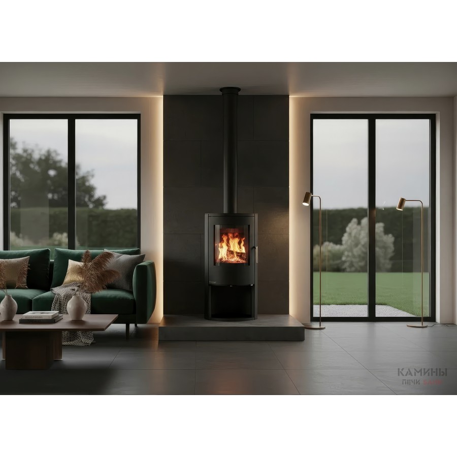 Корпус печи изготовлен из высококачественной котловой стали. Топочная камера защищена вермикулитовой футеровкой, которая повышает температуру горения, увеличивая КПД и снижая количество выбросов. Жаропрочное керамическое стекло выдерживает температуру до 750°C, позволяя безопасно любоваться живым огнем.