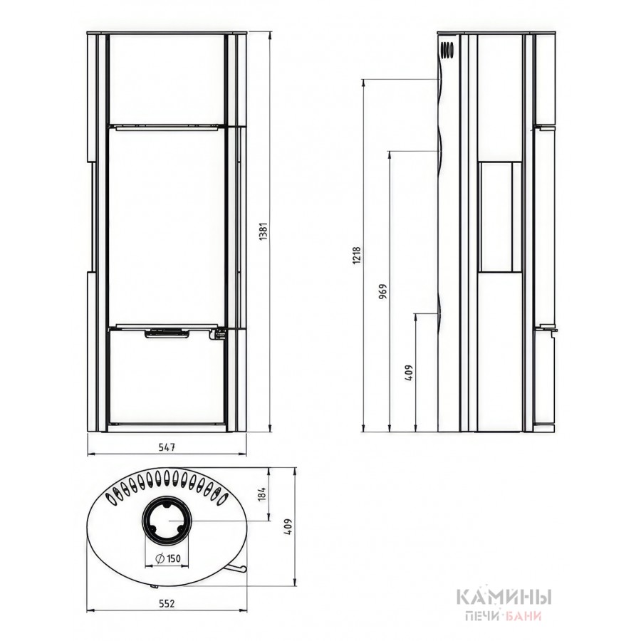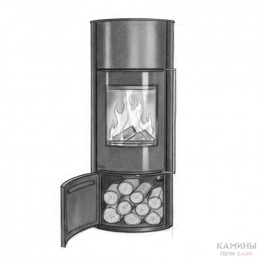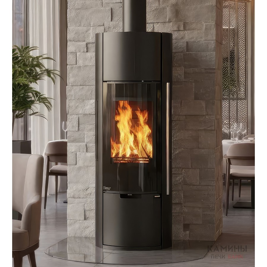 Модель оснащена системой внешнего подвода воздуха (CPV), что позволяет подключать забор кислорода с улицы или из подвала. Это критически важно для современных герметичных домов, так как камин не «выжигает» кислород внутри комнаты. В нижней части корпуса расположена высокая открытая ниша для дров, которая подчеркивает стройный силуэт печи.