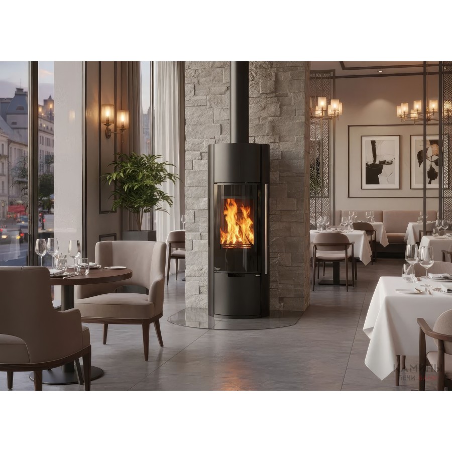 - Остекление Full Glass: Фасадное стекло с черной шелкографией по периметру полностью закрывает раму дверцы, обеспечивая беспрепятственный вид на пламя.