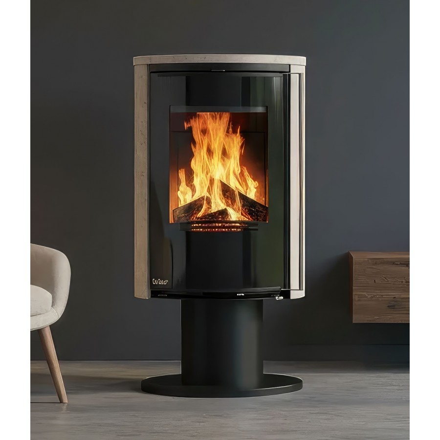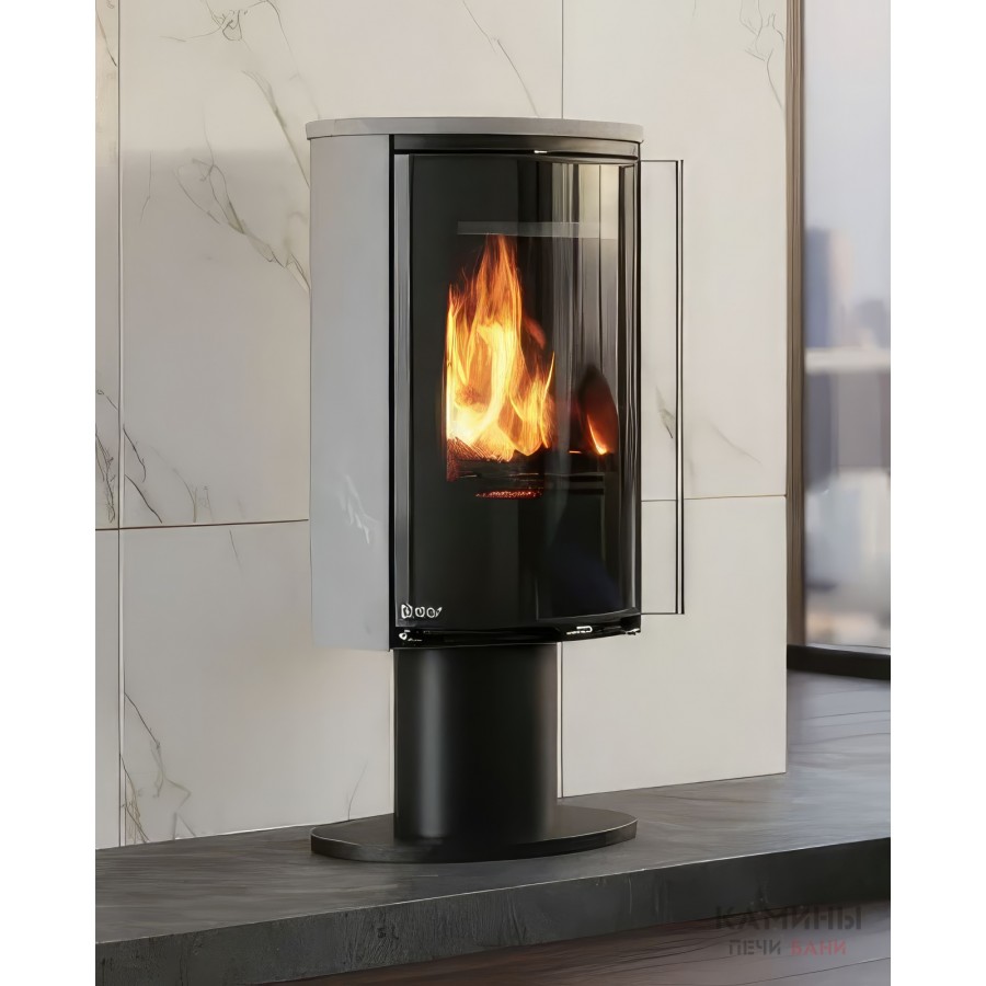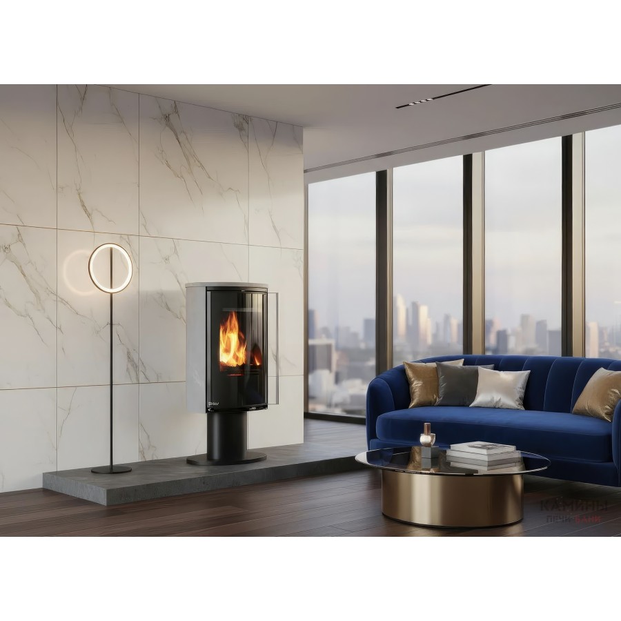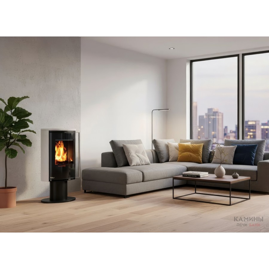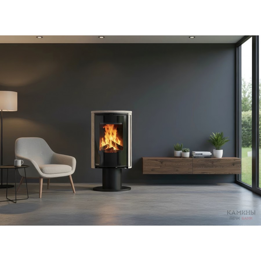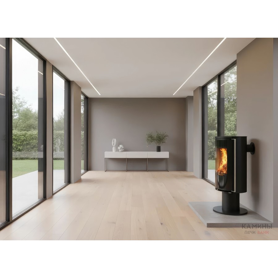 Модель оснащена системой внешнего подвода воздуха (CPV), что позволяет подключать забор кислорода с улицы или из подвала. Это критически важно для современных герметичных домов, так как камин не «выжигает» кислород внутри комнаты. В нижней части корпуса расположена высокая открытая ниша для дров, которая подчеркивает стройный силуэт печи.