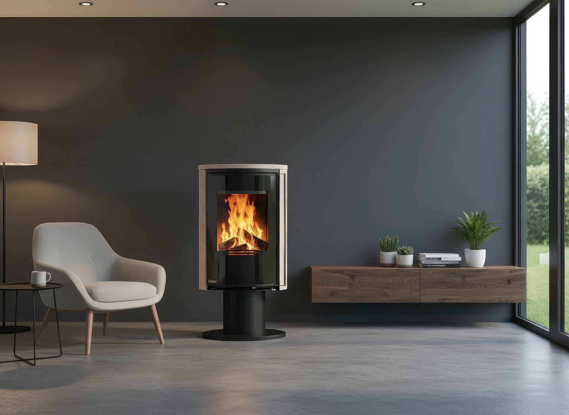 - Современный дизайн и качественные материалы — сталь и термобетон в топке.