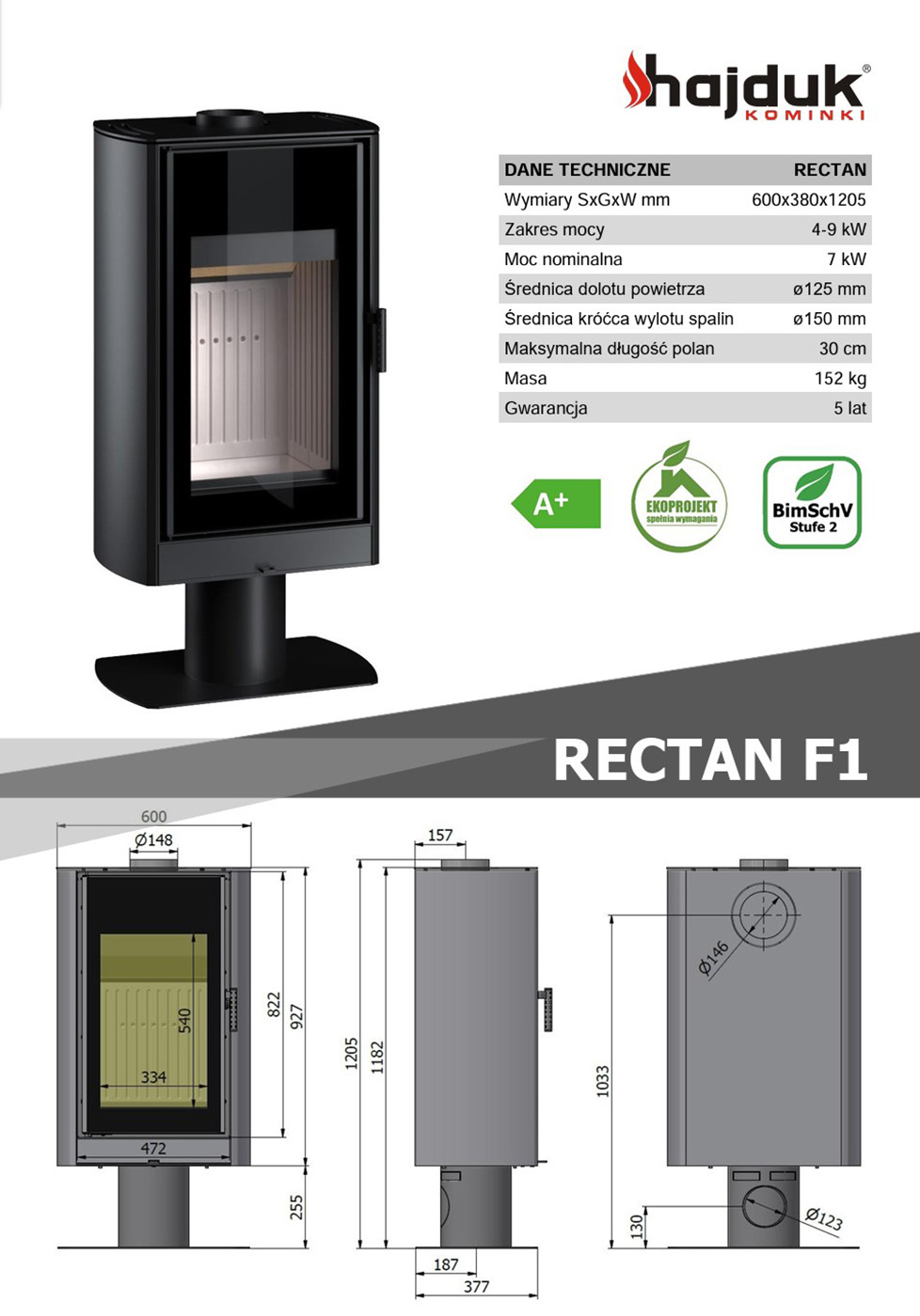 Каминная печь RECTAN имеет закрытую камеру сгорания, облицованную теплоаккумулирующей керамикой, съемную чугунную решетку и зольник. Воздухозаборное отверстие обеспечивает постоянный приток воздуха для сгорания, что делает ее подходящей для установки в домах с механической вентиляцией или системой рекуперации тепла. Многонаправленная система аэрации топлива и конструкция с тройным отклонением выхлопных газов обеспечивают идеальное сгорание и высочайший уровень эффективности. Эргономичный регулятор позволяет регулировать мощность в пять этапов, а вентилируемая ручка с фиксатором «Click» повышает комфорт пользователя. Все модели предлагают возможность установки выхлопного патрубка в двух плоскостях – вертикально вверх или горизонтально на задней стенке печи.