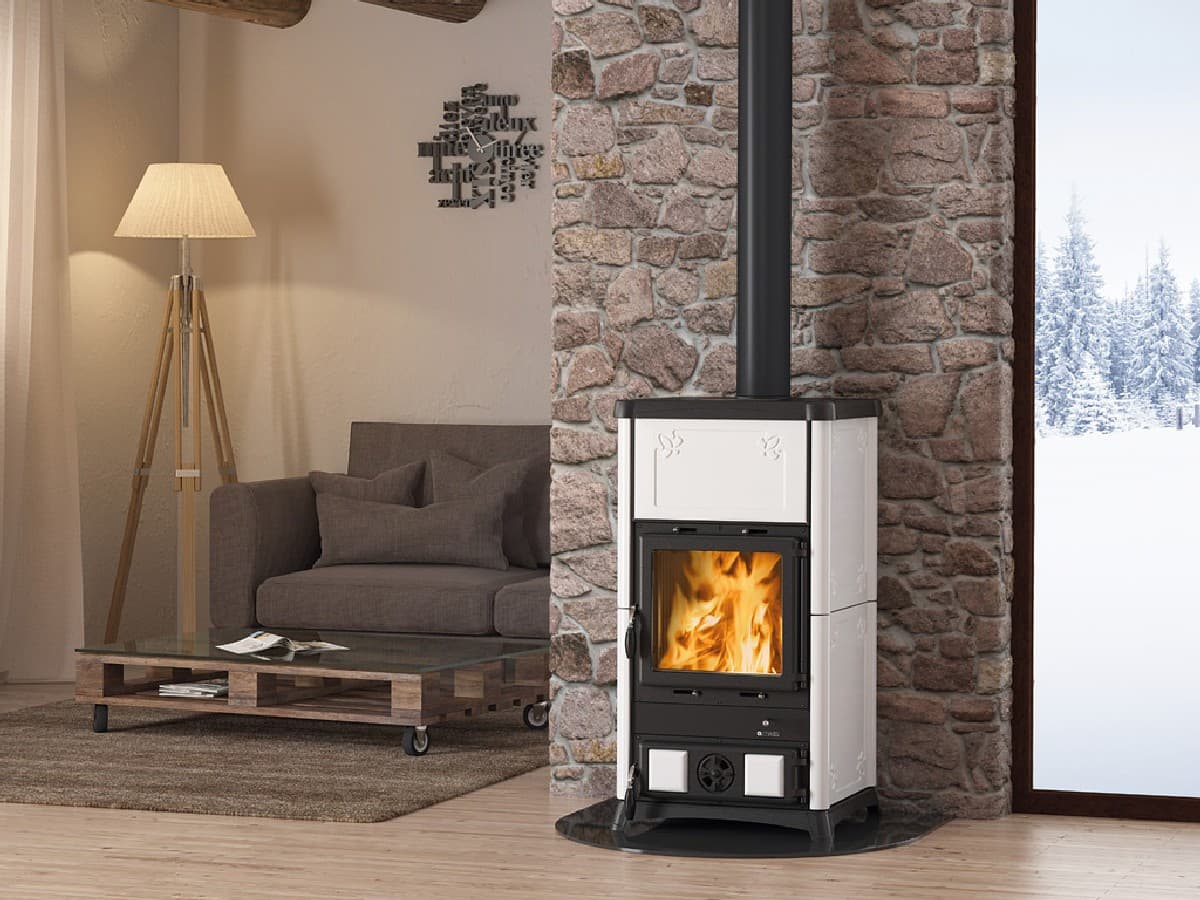 Дровяная печь-камин La Nordica Fedora с облицовкой майоликой (керамикой) или натуральным камнем.