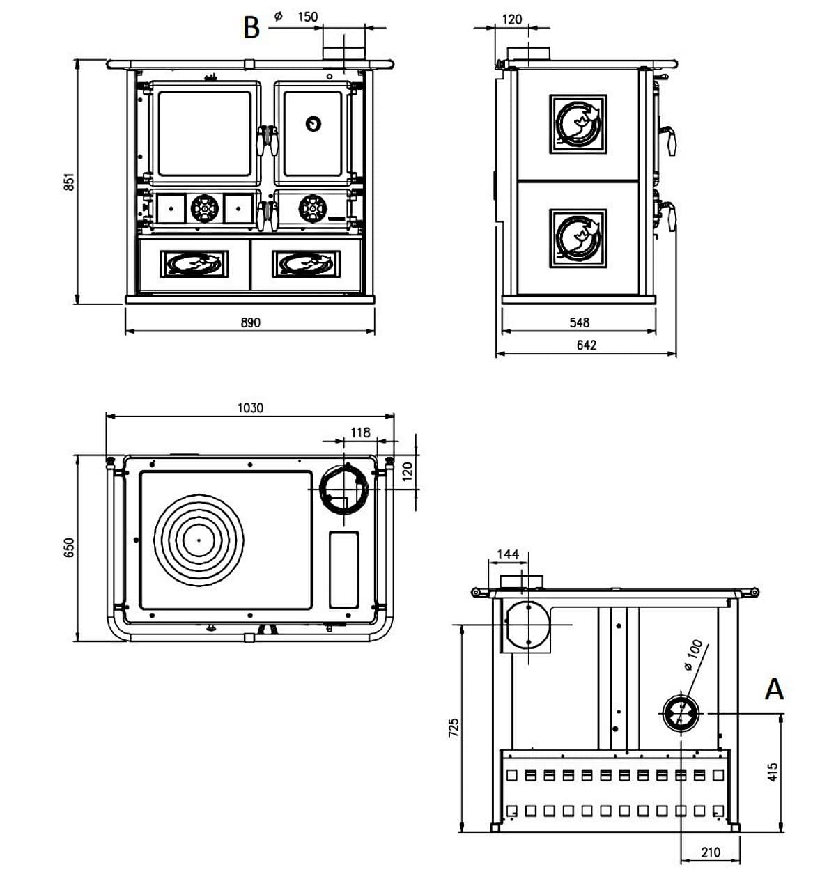 Топочная камера из чугуна • Внешняя облицовка натуральным камнемили майоликой • Дверцы и верхняя варочная панель изэмалированного чугуна • Стеклокерамика, устойчивая к высокимтемпературам до +750°