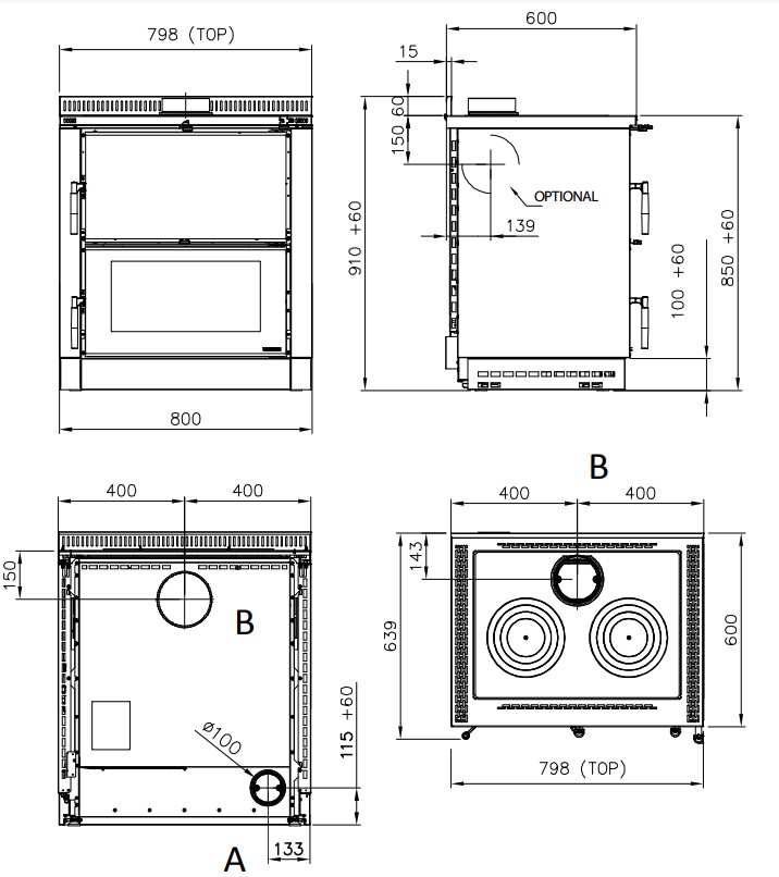 - Верхнее дымоотводное отверстие центральное, заднее, справа, левая сторона