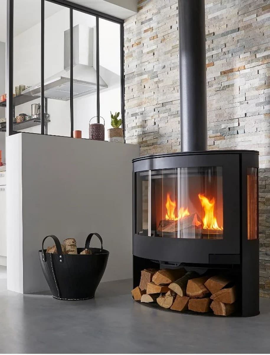Элегантная печь-камин Panadero Iris - обзорная печь со стальным корпусом из Испании. На топке установлено три стекла, через которые открывается потрясающий вид огня. Внизу предусмотрена небольшая дровница.