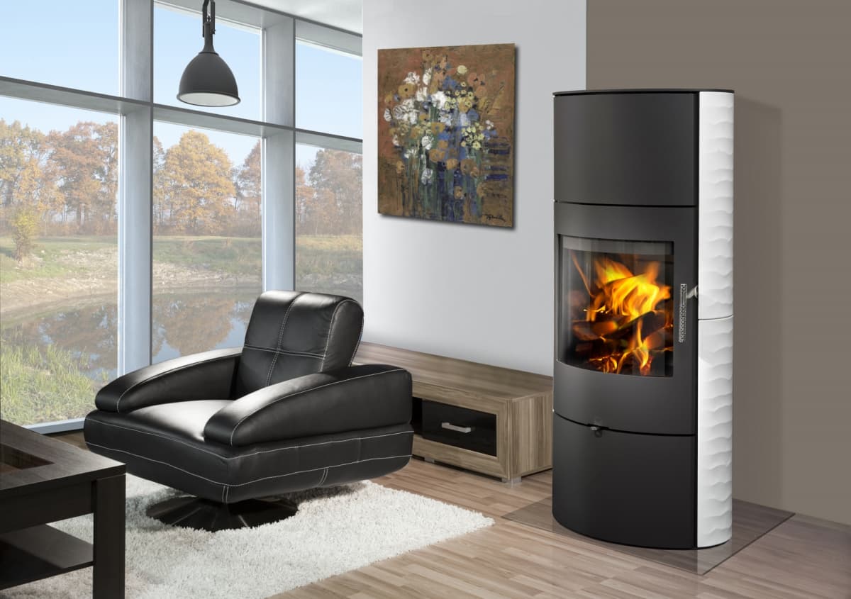 Печь-камин SONE 01 AKUM керамика с рельефной структурой - это стальная современная печь в керамической облицовке чешского производства от Romotop.