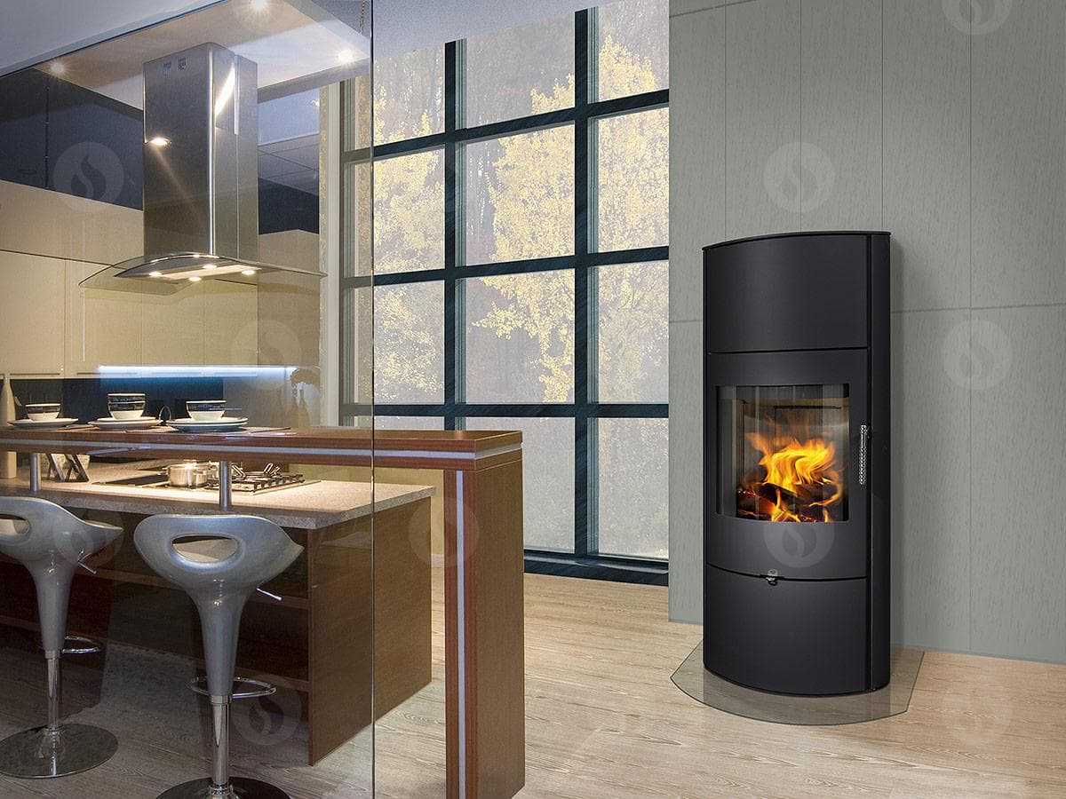 Печь-каминподходит для энергоэффективных домов. Обдуваемая дизайнерская ручка изнержавеющей стали позволяет осуществлять манипуляции во время топки.Печь-камин оборудована системой ЦПВ – центральной подачи наружноговоздуха. В стандартном варианте отвод дымовых газов может осуществлятьсясверху или сзади. Стекло дверцы омывается благодаря подаче вторичноговоздуха, поэтому загрязнения не оседают на стекле. Камера сгораниявыложена шамотной плиткой. Подачу первичного и вторичного воздуха можнорегулировать одним элементом управления. В нижней части печи-каминаможно хранить небольшой запас дров. К печи-камину можно докупитьаккумулирующие элементы, выделяющие тепло до 5,5 часов после прекращениягорения.