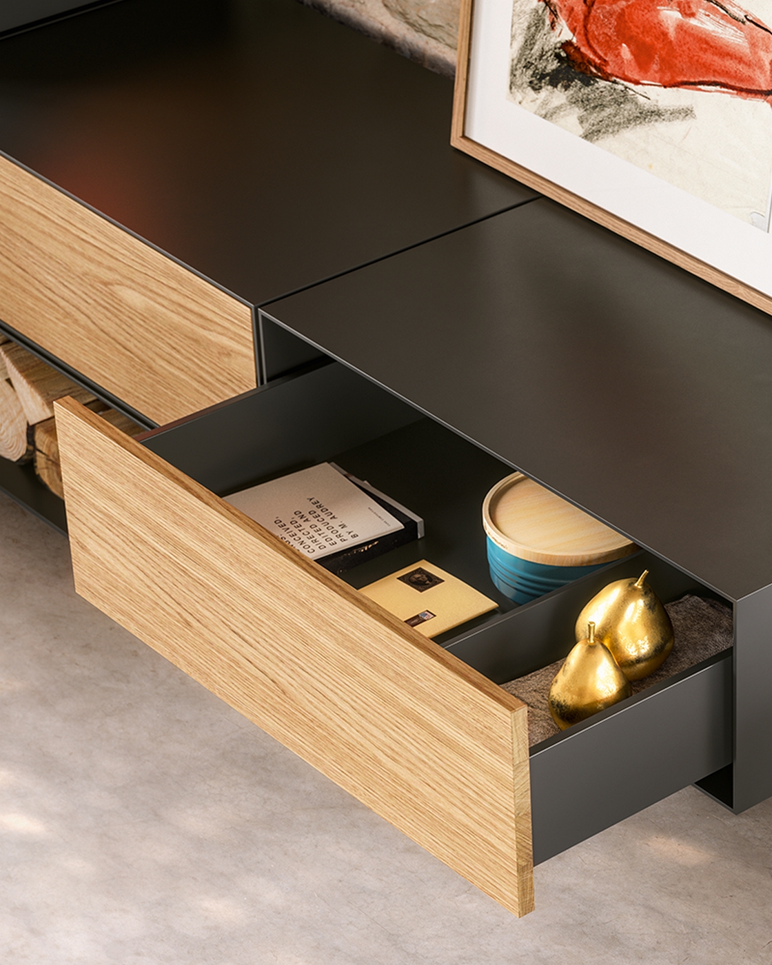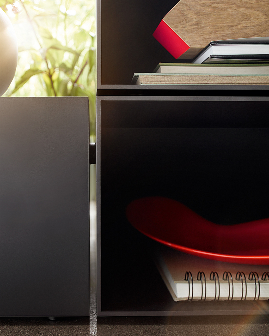 - Элементхранения доступен в двух вариантах длины (40,0/60,3 см);Дополнительная дверь (из стали) или ящик (с фасадом из стали или массивадуба) могут быть встроены.