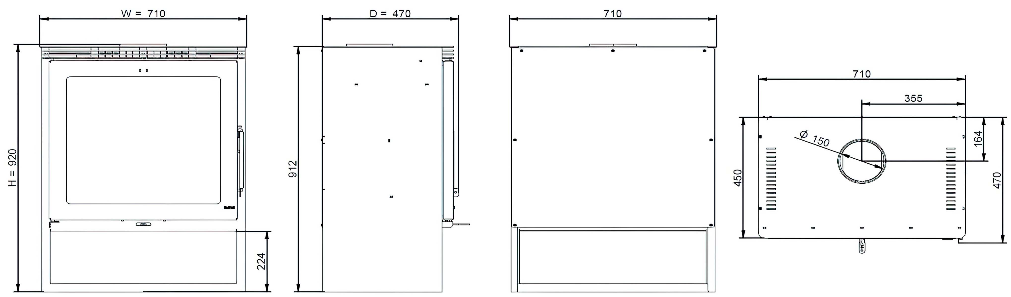 Модель имеет прямое остекление. Термостойкое керамическое стекло способно выдержать температуру до 750 °C при непрерывном использовании.