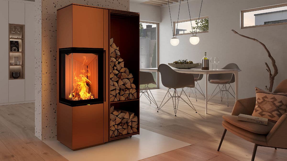 Печь-камин Spartherm Piko L с широким ящиком для дров в интерьере: