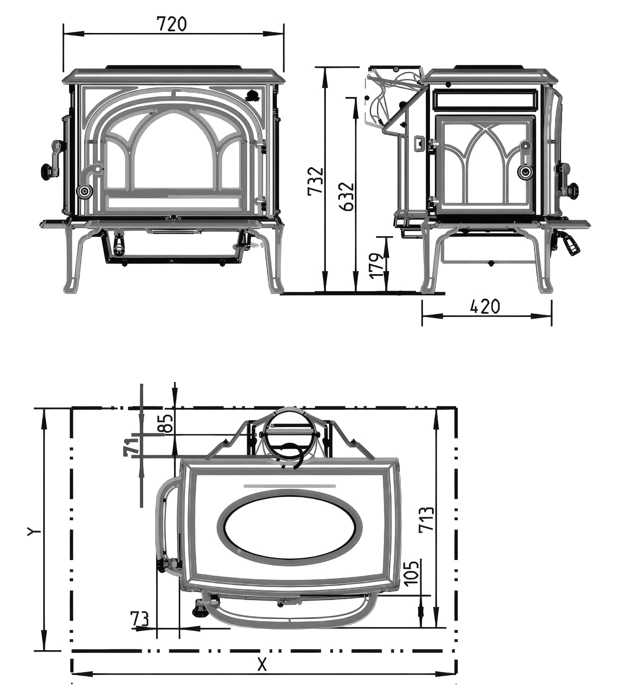 Чугунная печь – камин Jotul F 500 большая дровяная печь с классическим дизайном обладает одними из самых больших стеклянных дверей, что обеспечивает прекрасный вид на пламя. Возможность использовать боковые или фронтальные дверцы для загрузки дров, увеличивает количество вариантов его установки в интерьере. Производитель для данной модели выпускает дополнительные аксессуары: регулятор подачи внешнего воздуха O 75 мм, напольные пластины, ERS-01