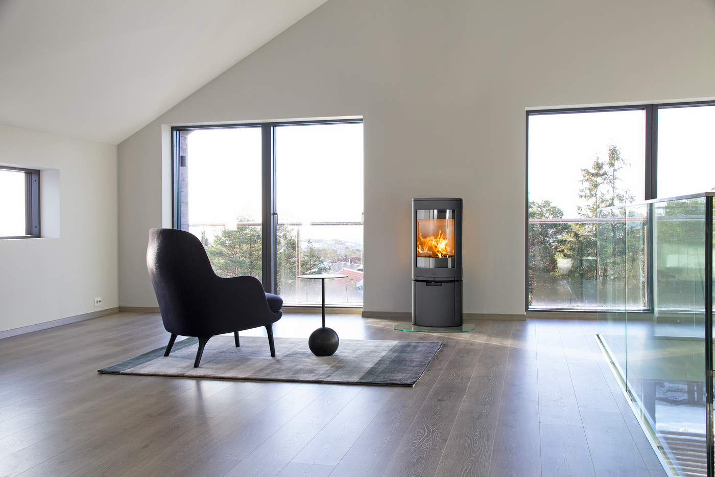 - Большие боковые стёкла для обзора огня