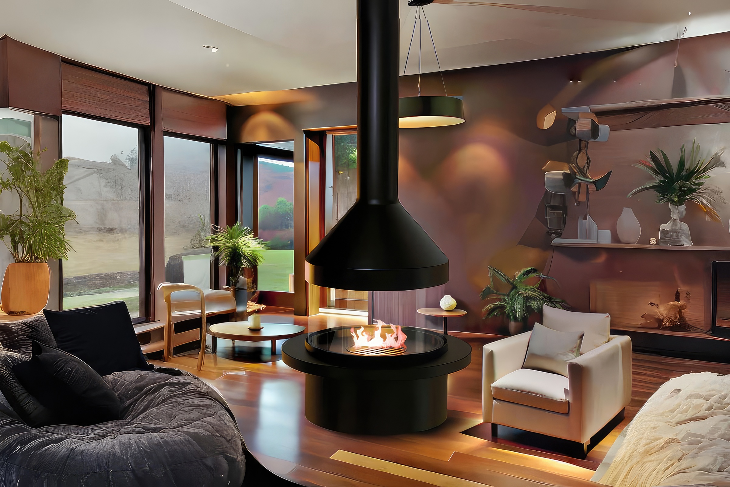 AVES 36 Флоренция — подвесной дизайнерский камин, выполненный из металла и жаропрочного стекла. Купольная конструкция с четырьмя стеклянными панелями формирует полусферу, создавая эффект чистоты формы и визуальной лёгкости. Панорамный обзор огня усиливает атмосферу уюта и стиля. Возможна установка на уровне пола, с встраиванием основания или размещением на дополнительной стальной платформе. Идеален для просторных помещений, оформленных в стиле хай-тек, минимализм или модерн.