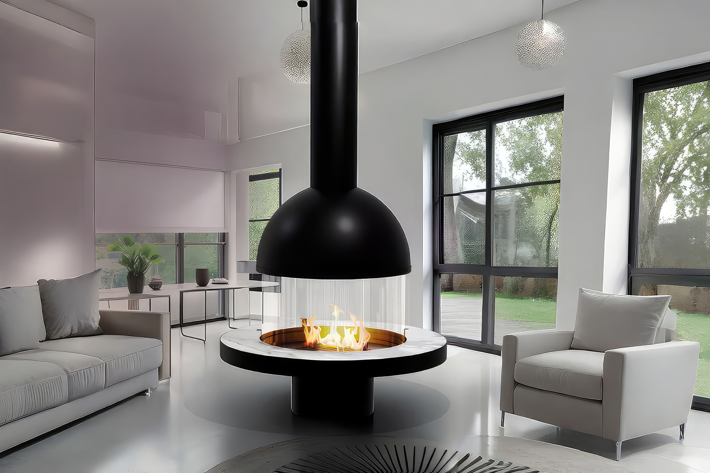 AVES 37 Матера — центральный дизайнерский камин, сочетающий металл и термостойкое стекло. Полукруглые раздвижные панели работают по принципу дверей шкафа-купе, позволяя использовать камин с открытой топкой. Дополнительная опция — полка под мрамор, подчёркивающая премиальность конструкции. Панорамный обзор огня создаёт атмосферу уюта и визуальной лёгкости. Идеален для просторных помещений, оформленных в стиле хай-тек, модерн или минимализм.