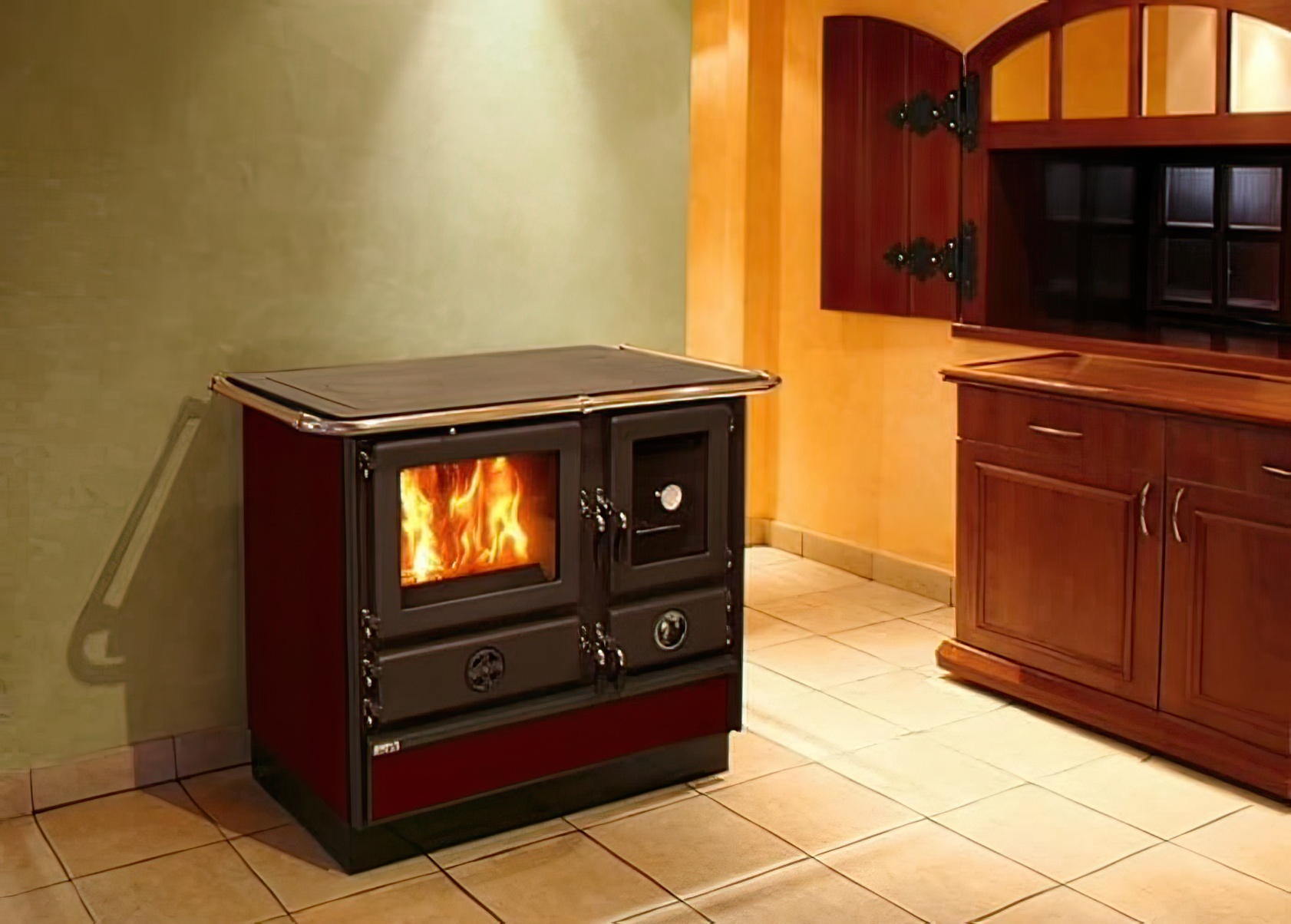 Дровяной камин предназначен для отопления загородных домов и приготовления пищи. Печь-каминизготовлена из чугуна и эмалированной стали. Эмалированное покрытие обеспечивает продолжительный срок службы печи иотвечает за эстетичный внешний вид. Доступно четыре цвета эмалированного покрытия: красный, кремовый,бордовый и черный. Печь укомплектована большой чугунной варочнойповерхностью с одной конфоркой и стальным эмалированным духовым шкафомдля приготовления пищи. Духовой шкаф габаритами ВхШхГ, мм - 265х350х465оснащён протвенем и датчиком температуры. Для подключения к системеводяного отопления используется теплообменник-змеевик объёмом 11 л имощностью 8.5 кВт.