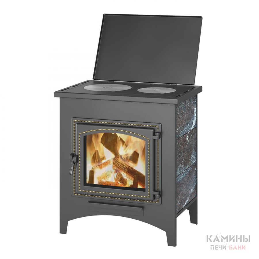 ВЕЗУВИЙ ПК-04 (240) с плитой, амфиболит 12 кВт (200 м3) Ø115мм укомплектована чугунным колосником и чугунной герметичной дверцей Везувий 240, а большое жаропрочного стекло позволяет контролировать процесс горения и любоваться пламенем. Топка печи-камина футерована легкозаменяемым, высококачественным шамотом, что защищает металл топки от воздействия высоких температур, продлевая тем самым срок службы печи, и удерживать температуру после топки. Наличие верхней чугунной плиты Везувий В3, с двумя комфорками, позволяет использовать печь-камин для приготовления пищи.