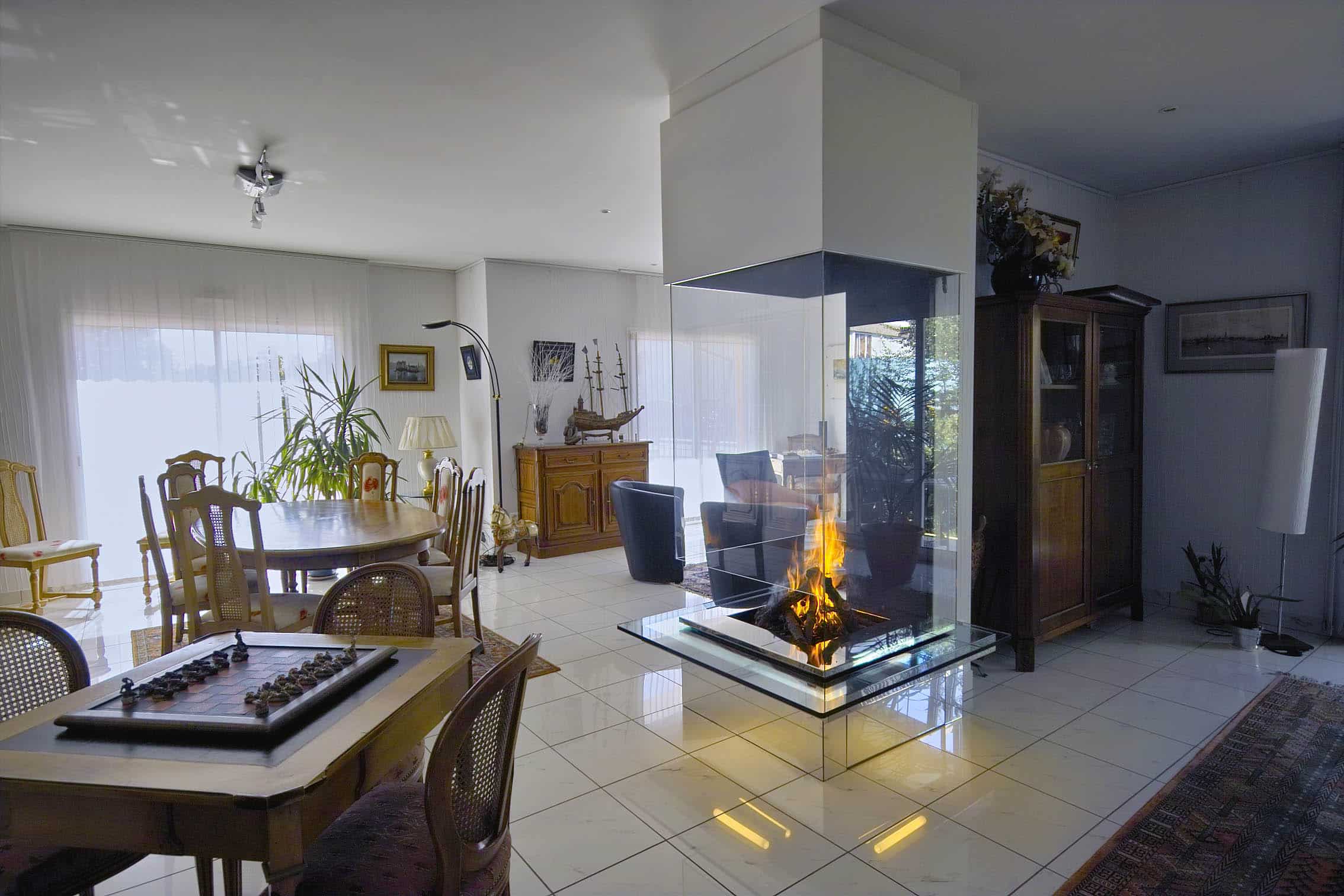 Этот современный камин свисает с потолка и прилегает к торцевой стене, разделяющей гостиную и столовую. Он полностью открыт и виден со всех сторон. В качестве топлива используются дрова (может быть также под заказ газовым, этаноловыми или электрическими).