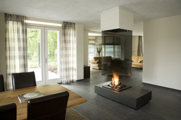 Этот современный камин расположен между тремя зонами: гостиной, столовой и кухней. Игрой пламени можно насладиться со всех сторон.