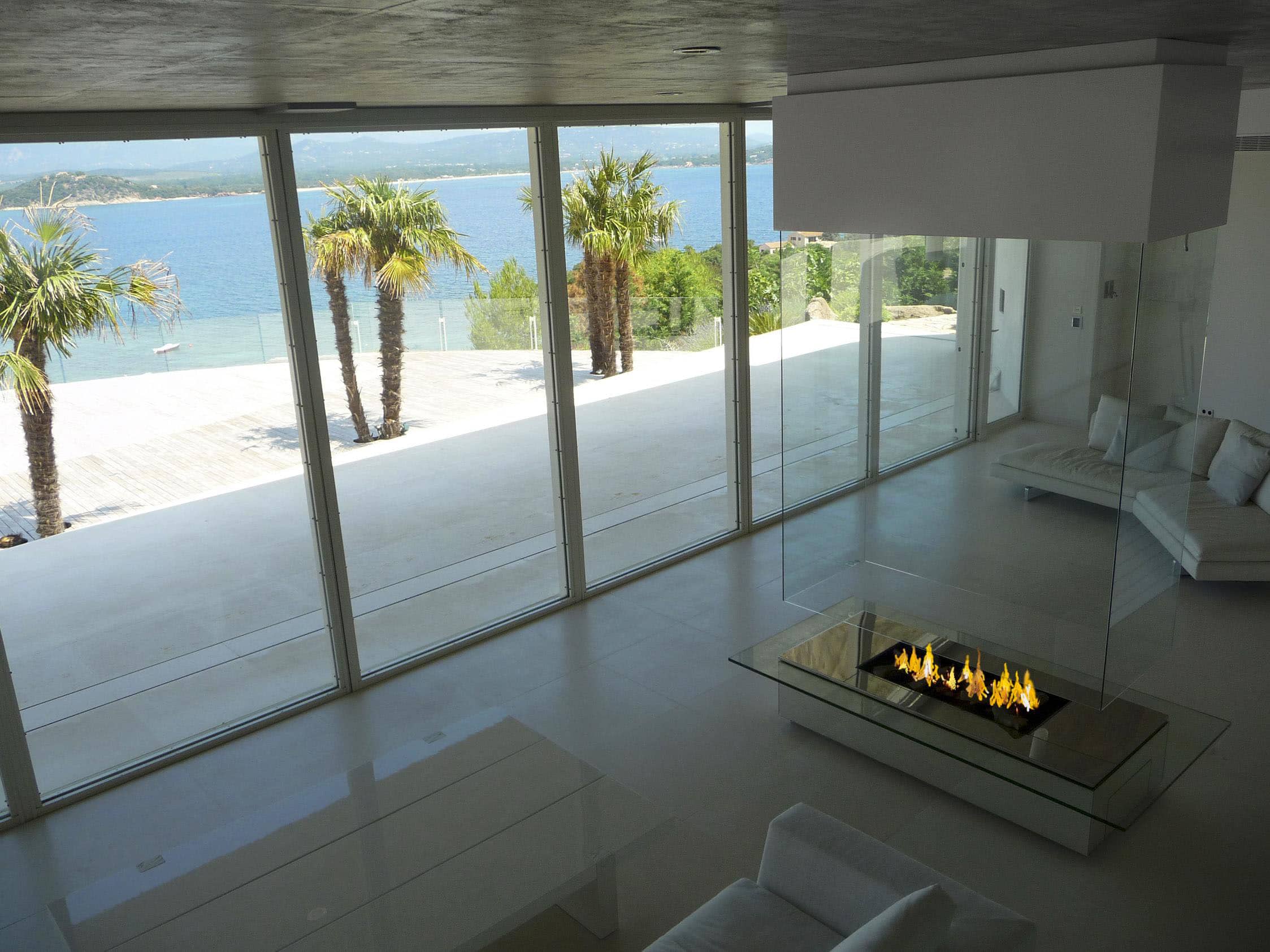 Огромный подвесной камин под высоким потолком в центре гостиной площадью 200 м2 с открытым видом на бассейн и океан на острове. Этот современный роскошный камин, без сомнения, является центральным элементом этого особняка.