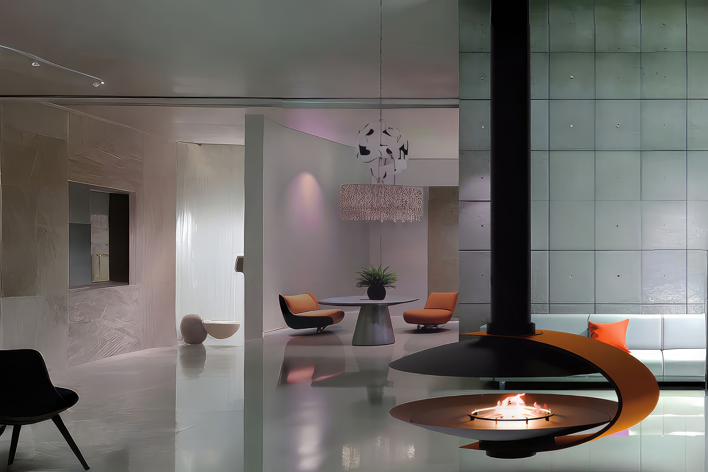 Базовое исполнение — в элегантном чёрном цвете, подчёркивающем геометрию корпуса. Камин подвешивается к потолку, создавая эффект парения и визуального центра пространства. Идеально подходит для просторных гостиных, холлов, салонов и загородных домов. Совместим с электрокамином или биотопливной топкой.