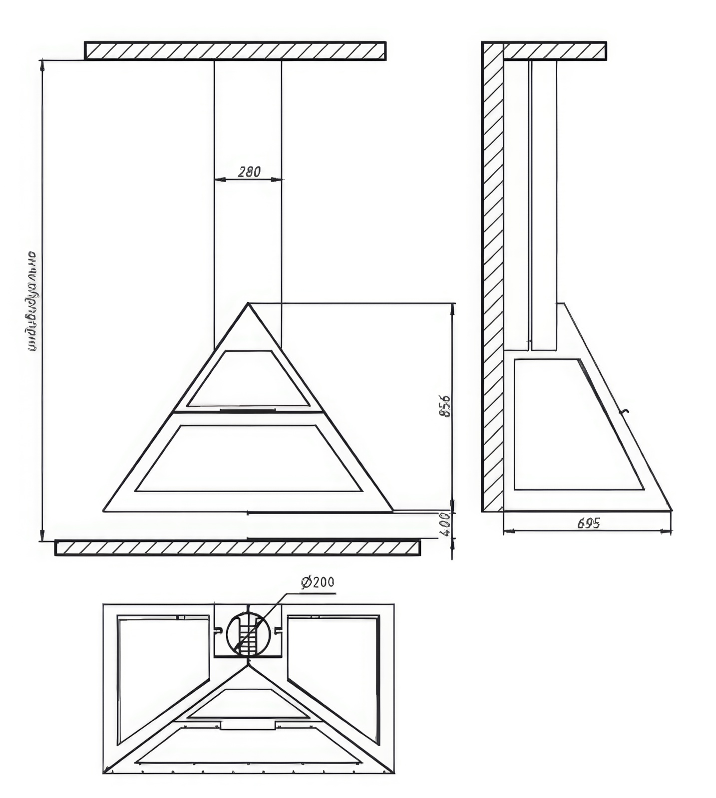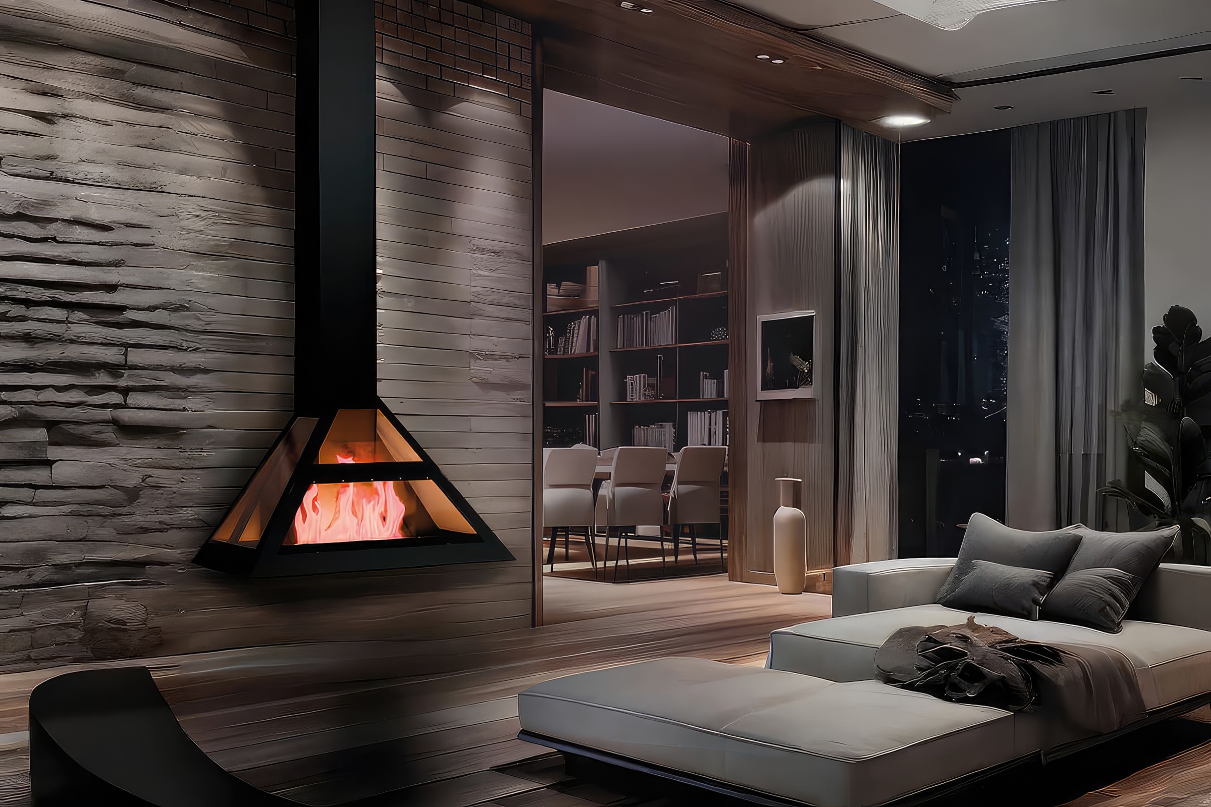 Модель оснащена верхним подключением дымохода и декоративным металлическим кожухом, который скрывает трубу и подчёркивает архитектурную целостность конструкции. Камин подвешивается к потолку, создавая эффект парения и визуального центра пространства. Подходит для просторных гостиных, загородных домов, салонов и коммерческих помещений.