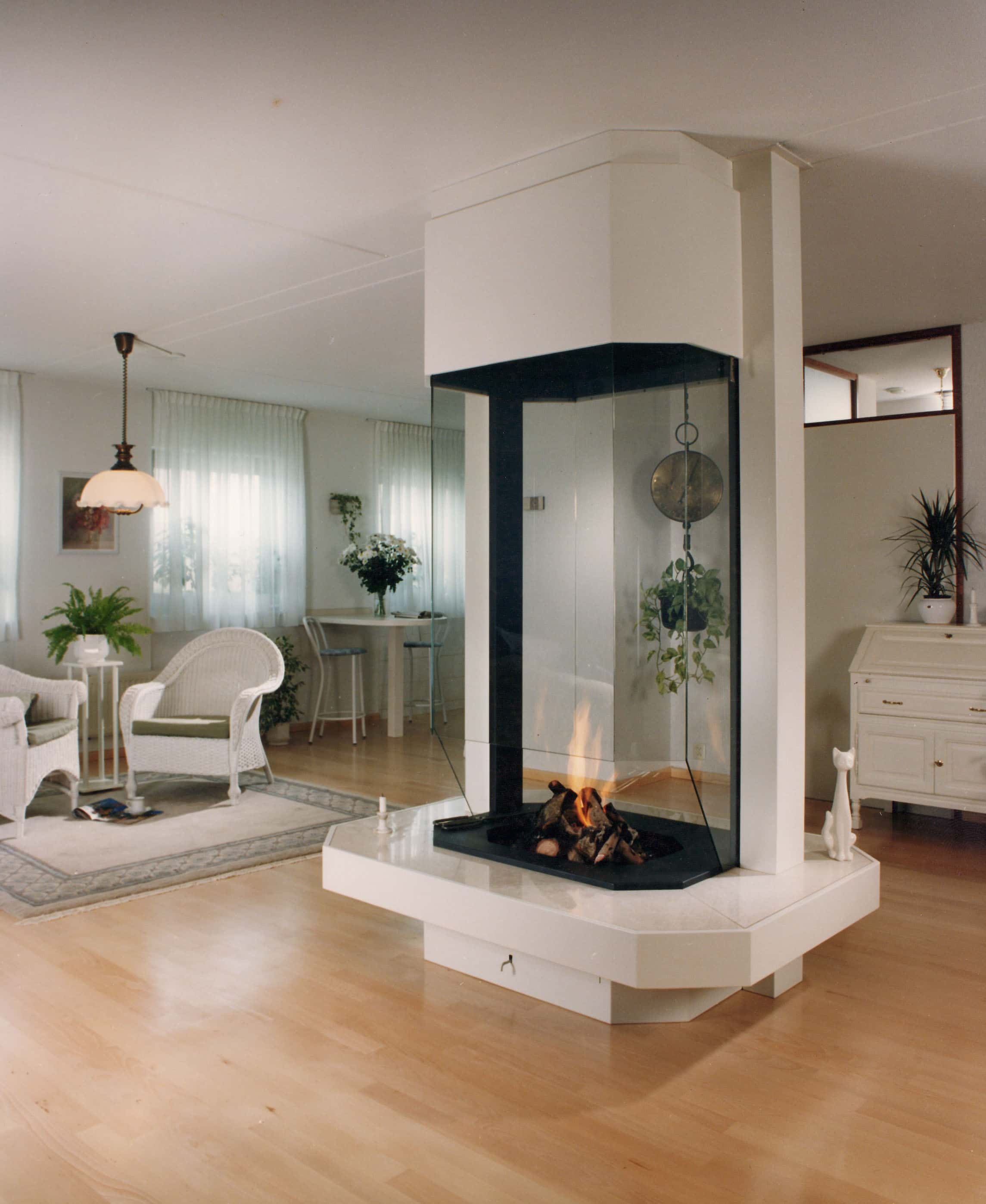 Двусторонний современный камин, расположенный между двумя колоннам. Работает на газе (тип газа может быть как природный, так и пропан). Огонь можно включать и выключать с помощью дистанционного управления, а газовая горелка имеет три защитных стопора.