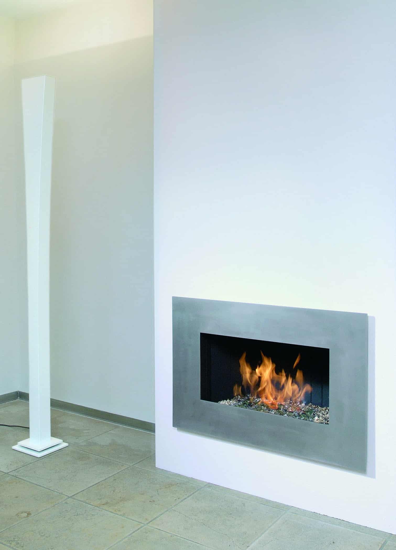 Этот современный камин покрыт отделкой из матовой нержавеющей стали с внутренней топкой из черной стали.