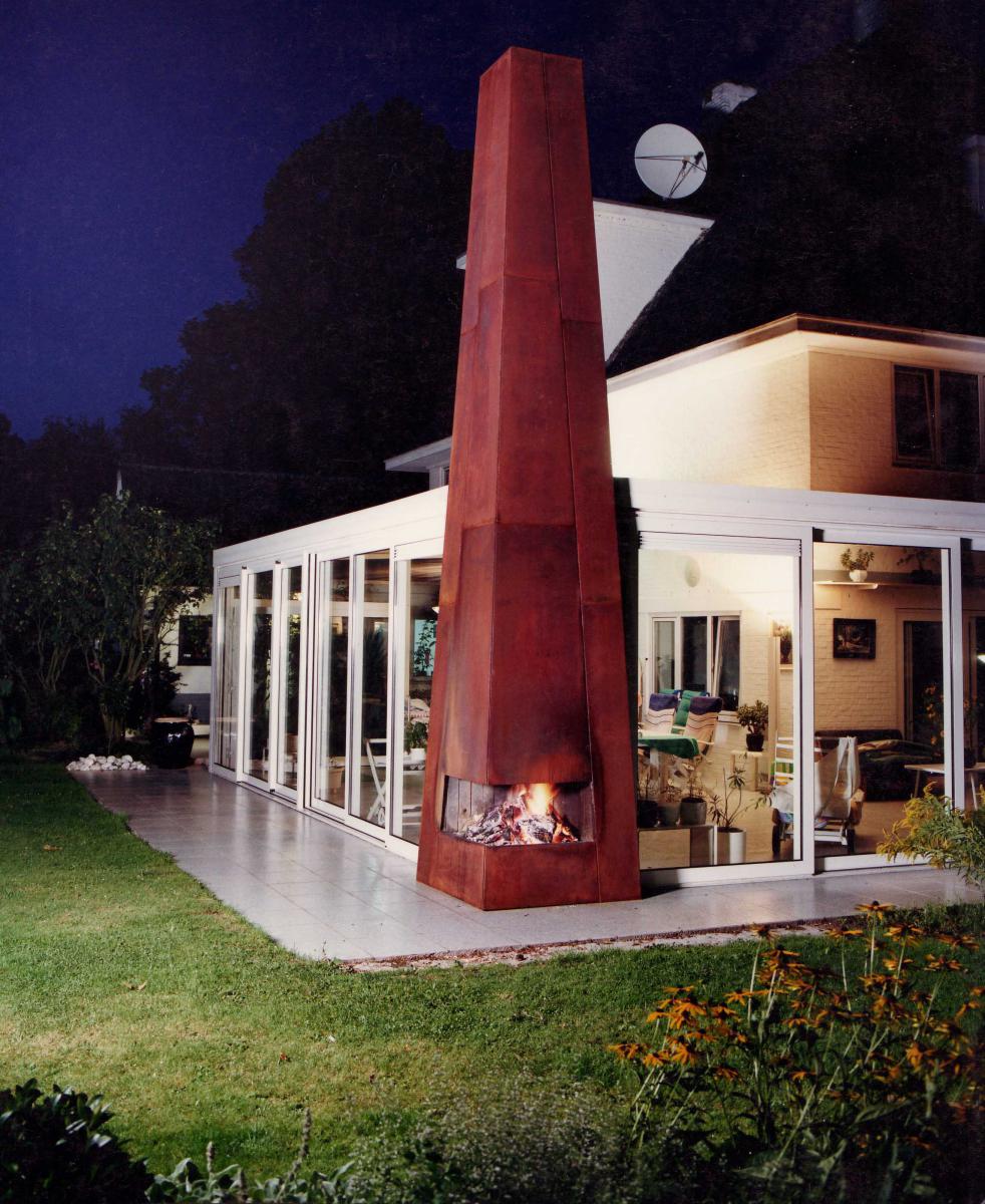 Этот уличный камин изготовлен из стали Corten с внутренней конструкцией из черной стали и имеет скрытый / съемный поддон для золы.
